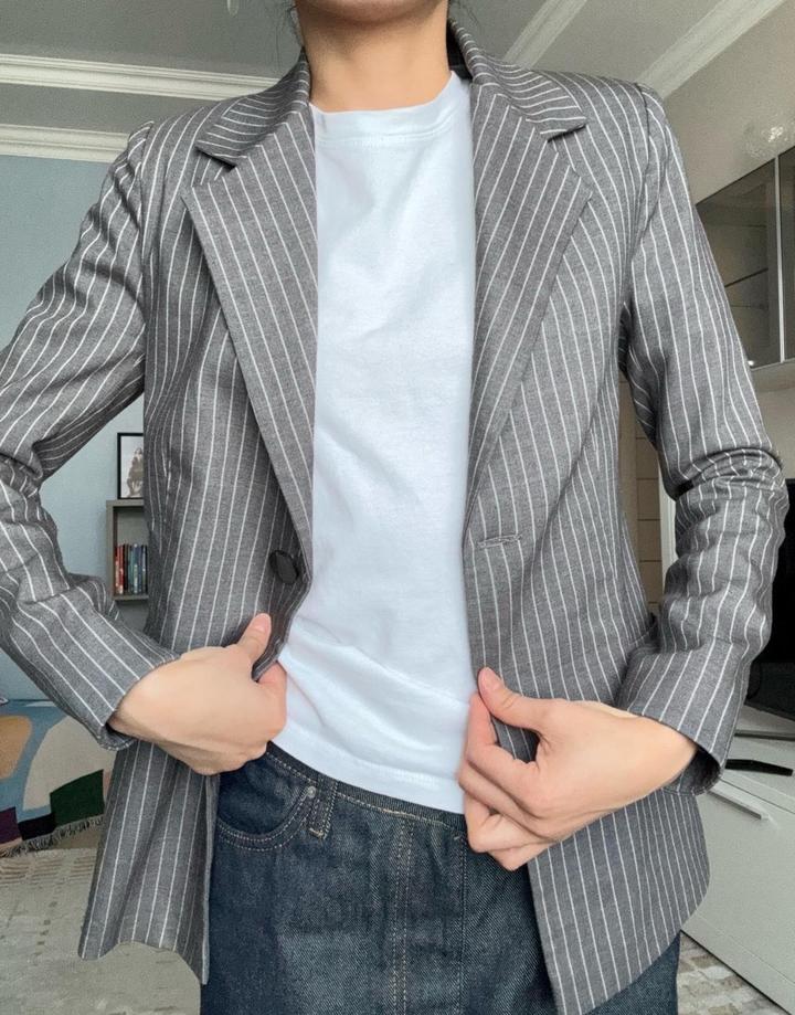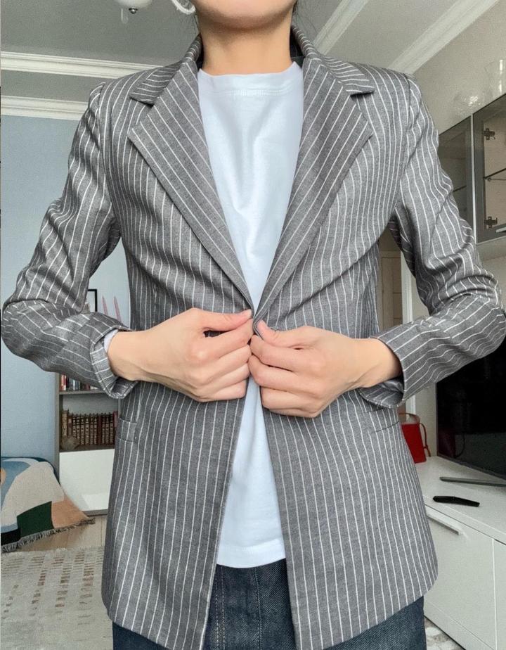 Пиджак в тонкую вертикальную полоску с классическими лацканами, который подчёркивает силуэт и добавляет образу аккуратности и структуры. К нему есть брюки. Артикул: 449897