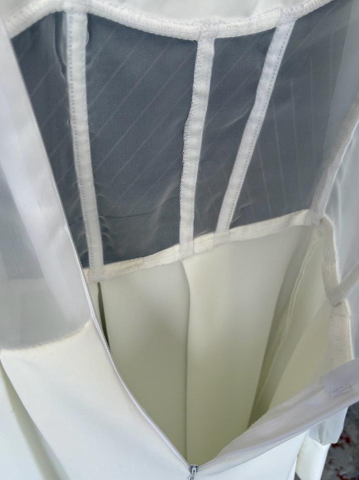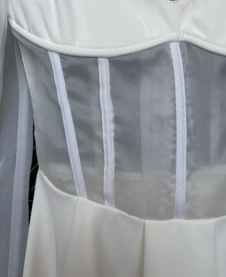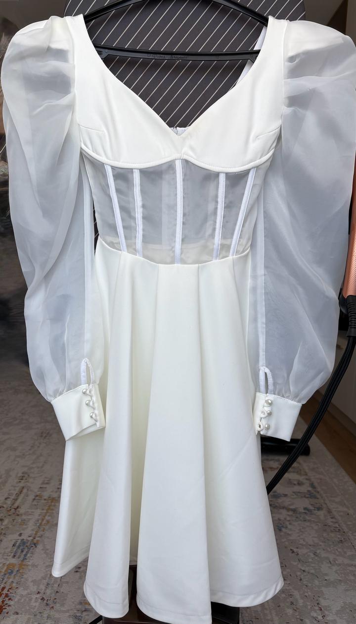 Продам нежное кремовое платье с корсетным верхом и воздушными рукавами с акцентом на талии, было сшито на заказ, верх выполнен в корсетном стиле с вертикальными косточками, которые красиво формируют силуэт и подчеркивают фигуру (на размер xxs), без чашечек Манжеты украшены аккуратными пуговицами Артикул: 450185