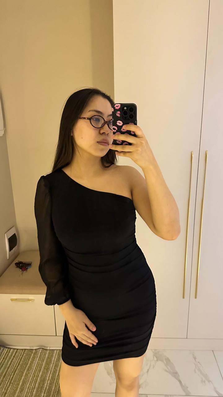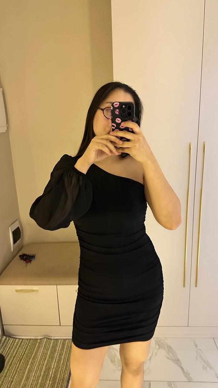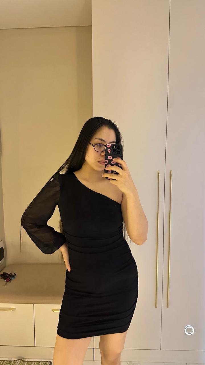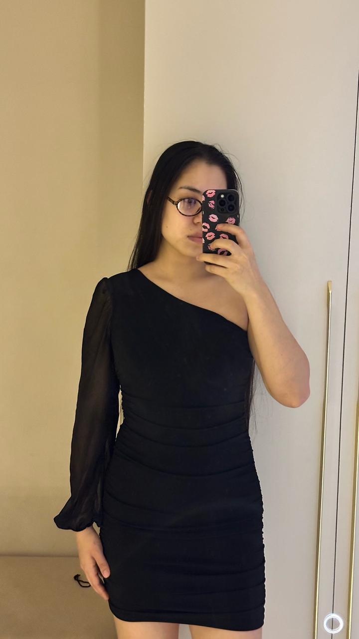 Элегантное черное мини-платье, которое идеально подчеркивает фигуру и создает утонченный вечерний образ. Главная «фишка» этой модели — асимметричный крой. Открытое плечо в сочетании с одним объемным прозрачным рукавом из шифона выглядит дорого и стильно. Благодаря эффектной драпировке (сборке) по всей длине, платье идеально садится по фигуре, скрывая мелкие нюансы и акцентируя внимание на изгибах. Носила только один раз на мероприятие. Артикул: 450359