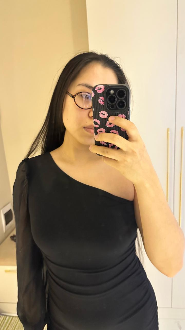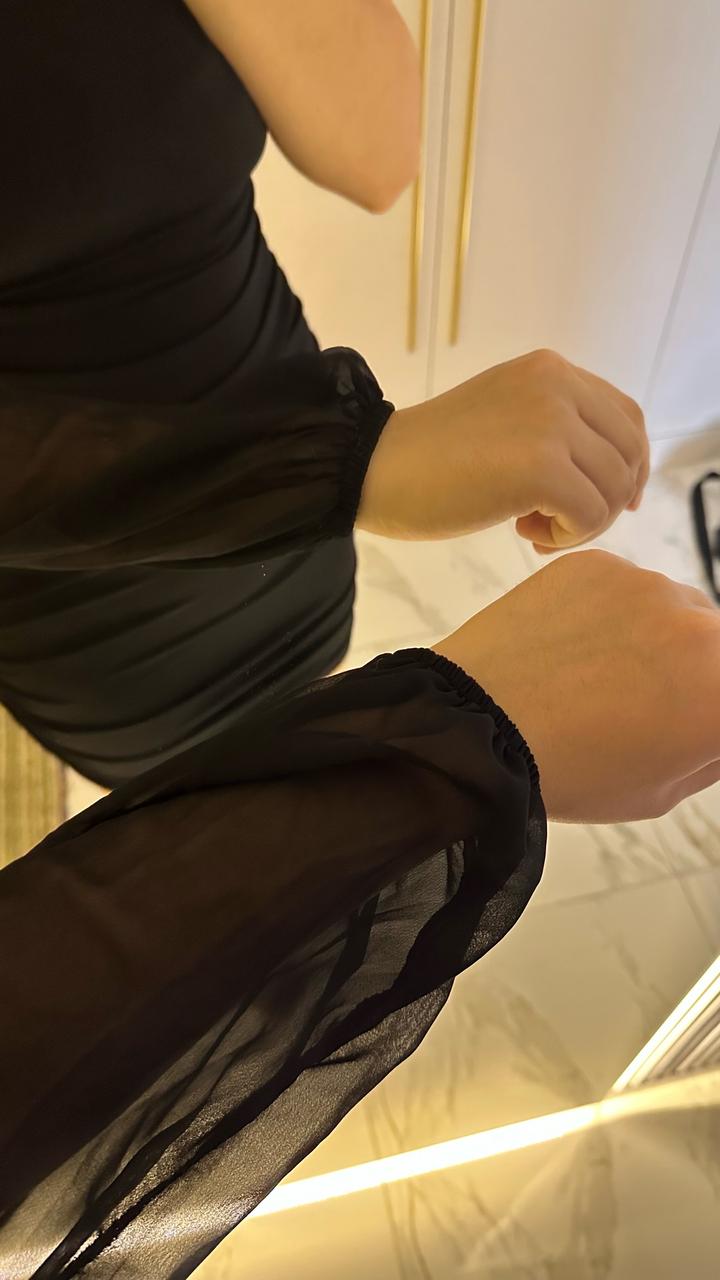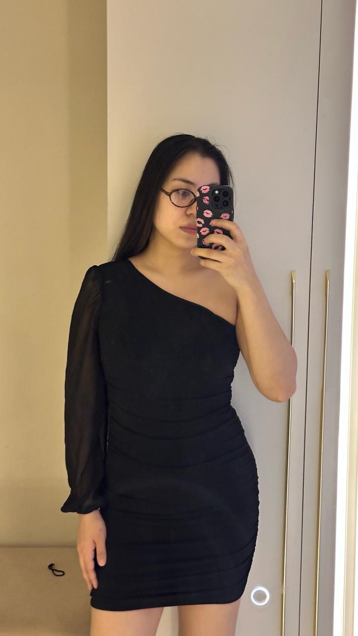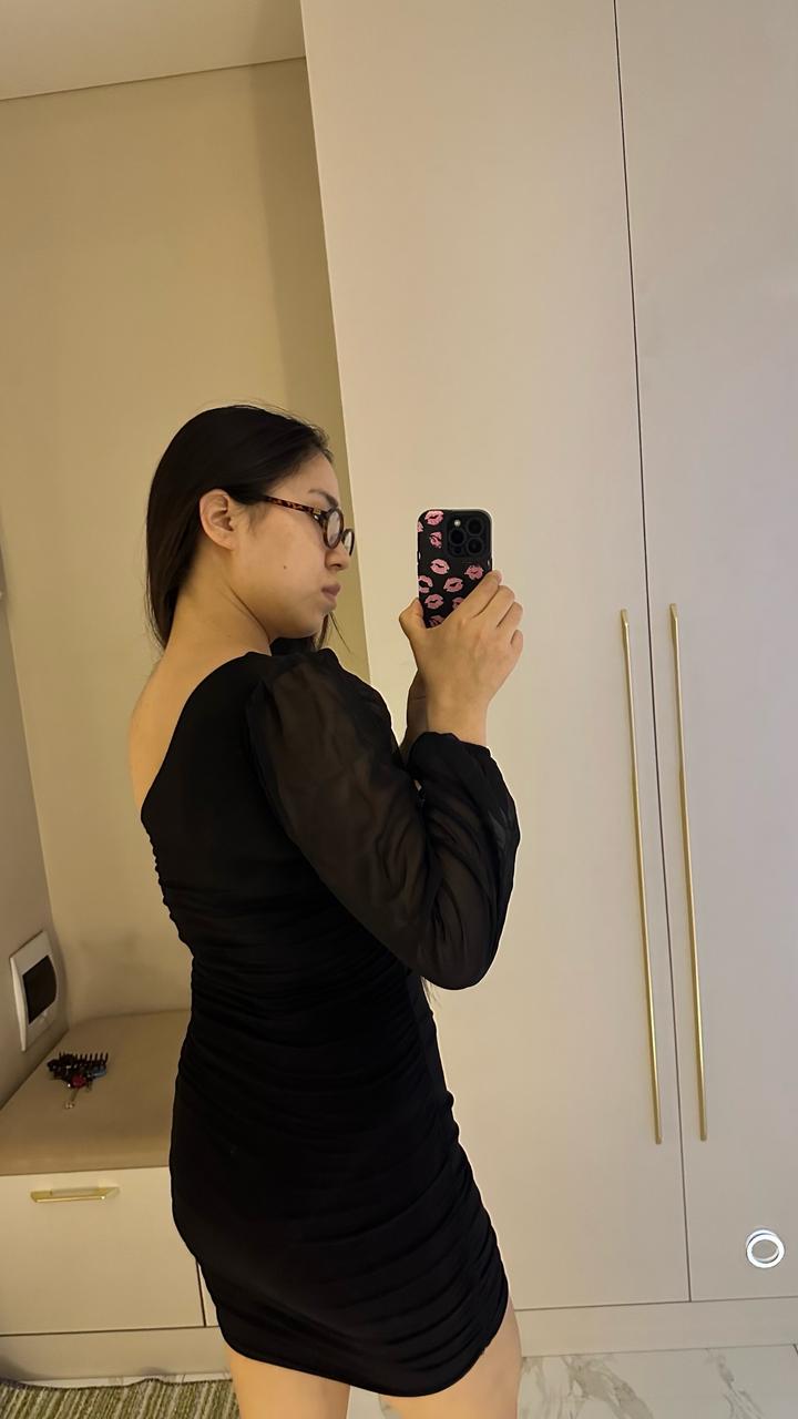 Элегантное черное мини-платье, которое идеально подчеркивает фигуру и создает утонченный вечерний образ. Главная «фишка» этой модели — асимметричный крой. Открытое плечо в сочетании с одним объемным прозрачным рукавом из шифона выглядит дорого и стильно. Благодаря эффектной драпировке (сборке) по всей длине, платье идеально садится по фигуре, скрывая мелкие нюансы и акцентируя внимание на изгибах. Носила только один раз на мероприятие. Артикул: 450359