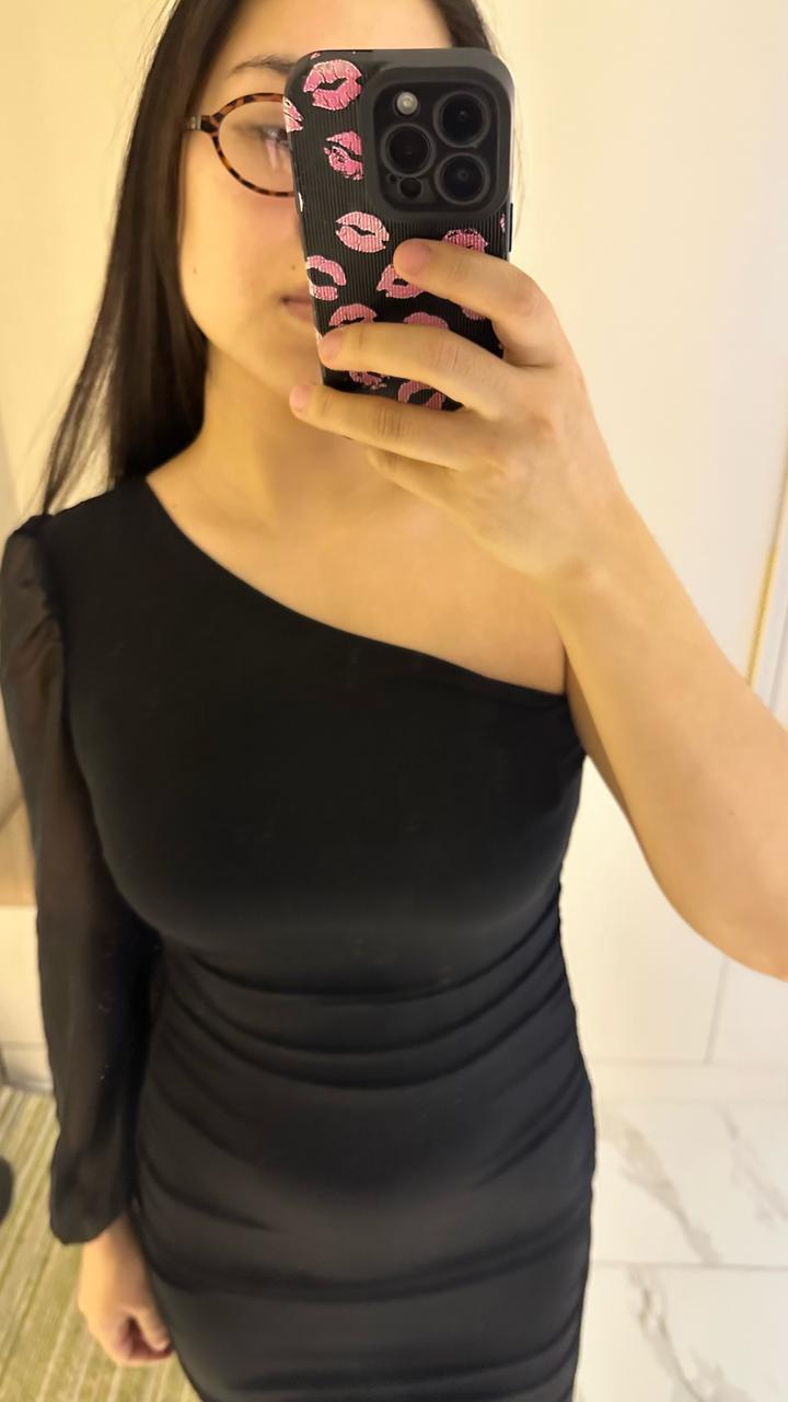 Черное облегающее платье на одно плечо с шифоновым рукавом (S/M)S/M