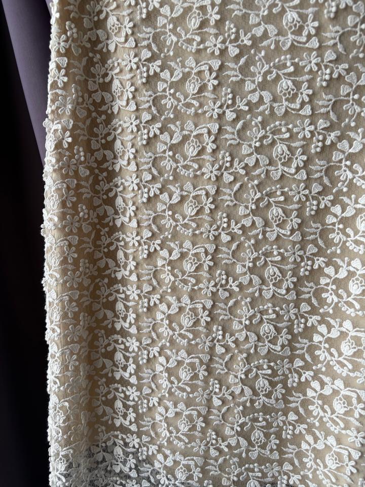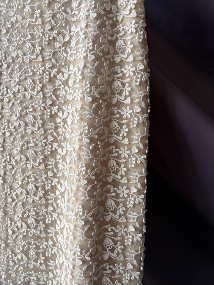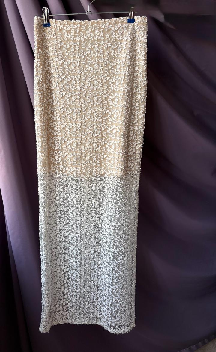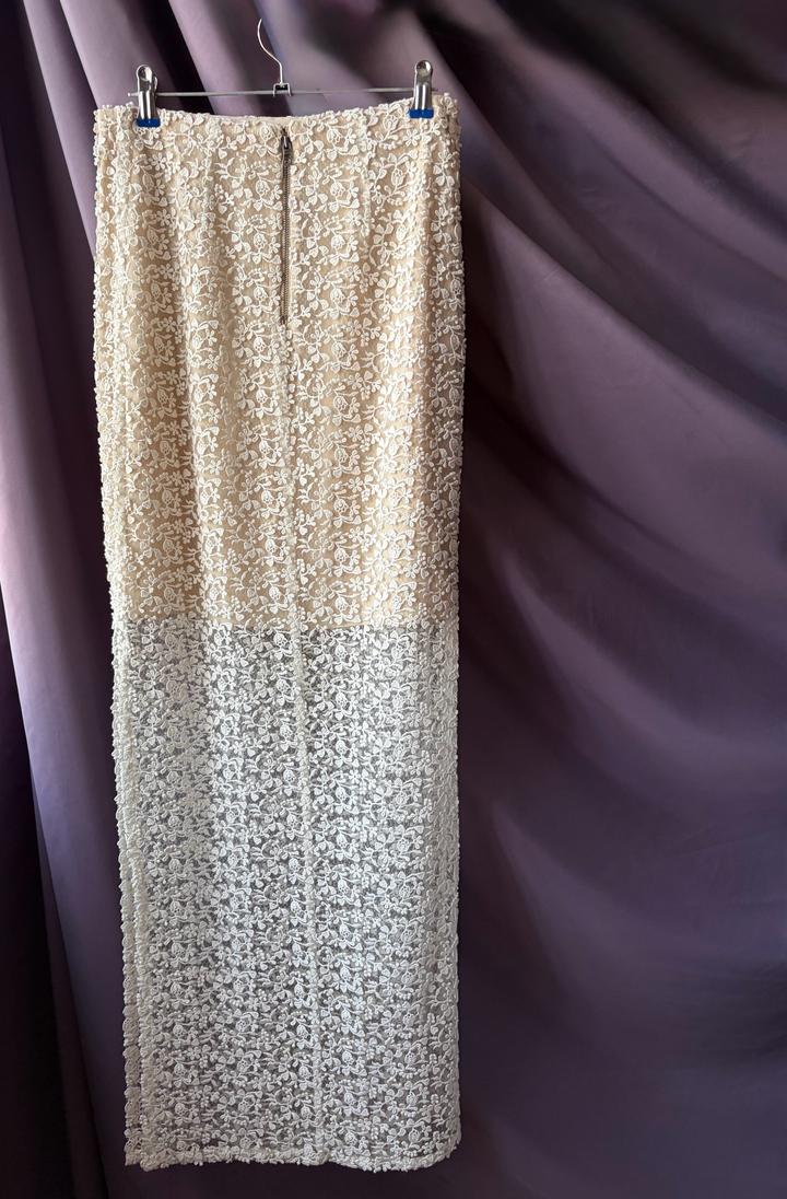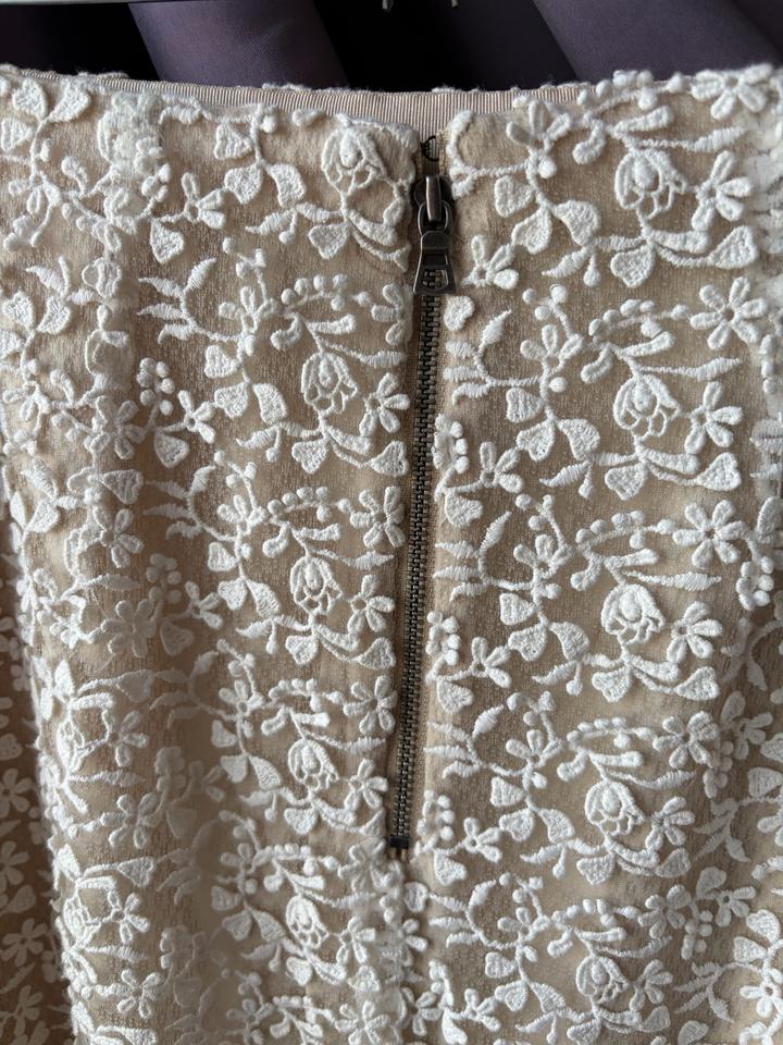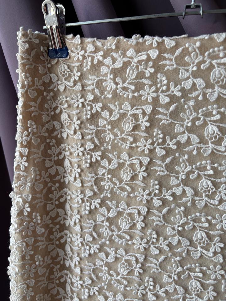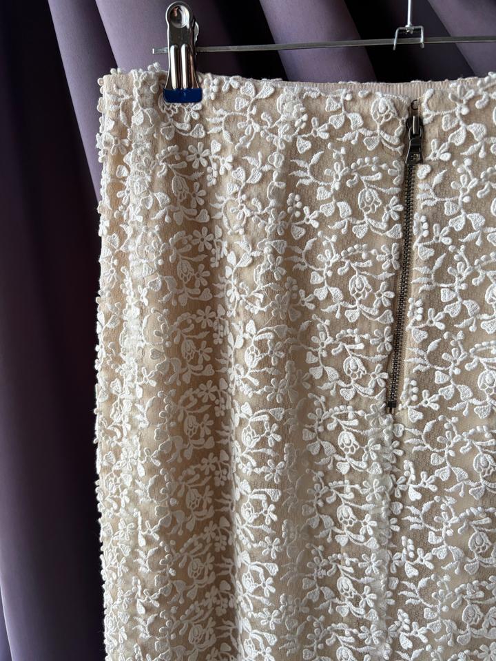 Не винтаж! Юбка в нежном бежевом оттенке, выполнена из кружевного полотна с цветочным узором поверх короткой юбки выше колена. Тянется, что создает комфортную и аккуратную посадку. Подчеркивает силуэт. Состав: кружево нейлон, подкладка полиэстер. Длина юбки 108см. Длина пояса 34см. Состояние 10/10. Артикул: 450614