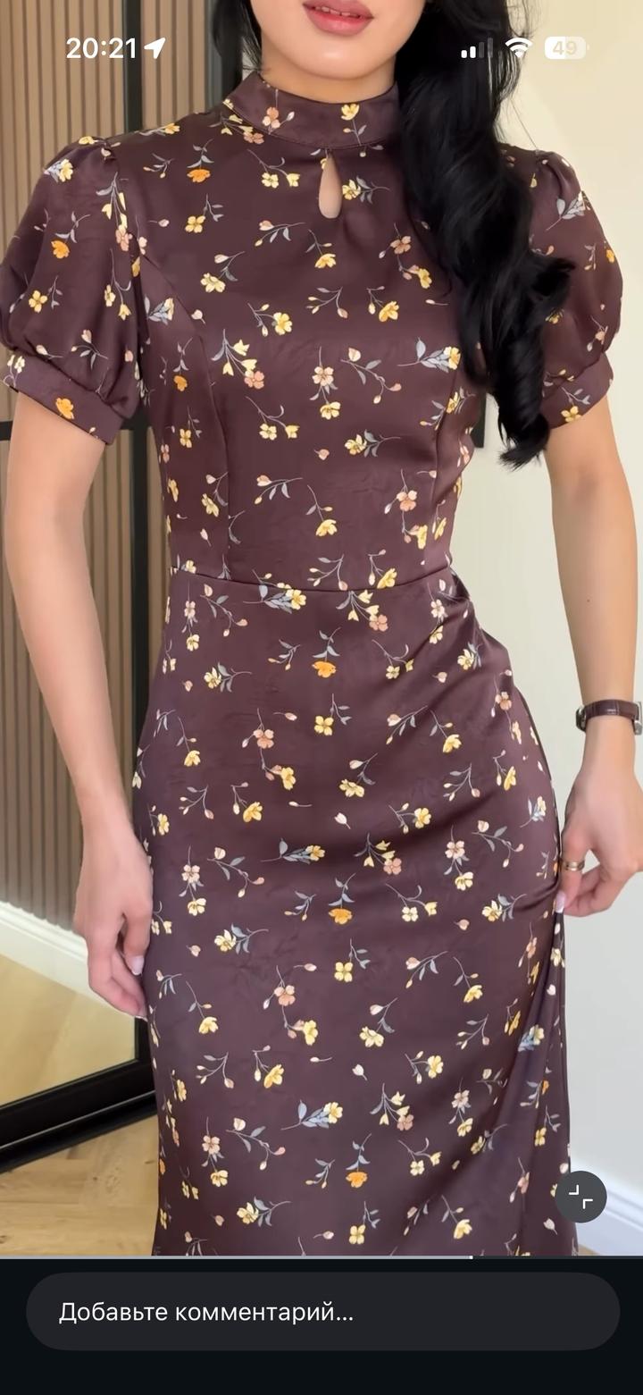 Платье коричневое атлас цветочный принт. Сзади есть шнуровка, талия регулируется . Размер М. Длину укоротила под рост 165. Надевала 1 раз. Очень красивое платье Артикул: 450941
