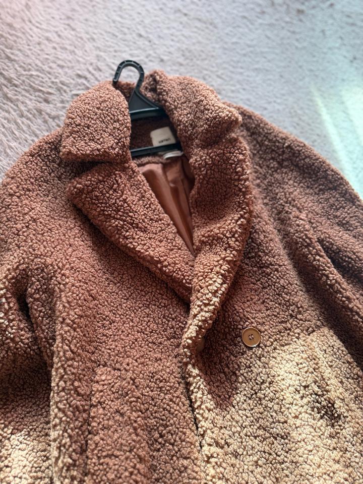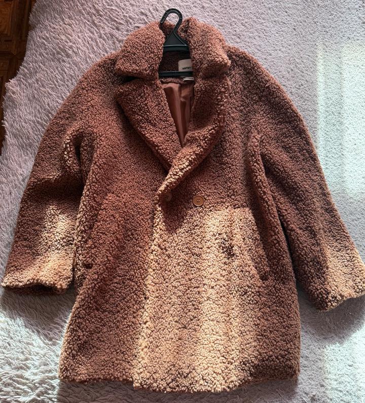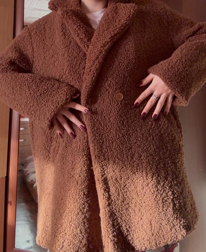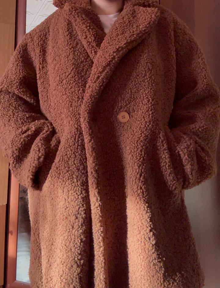 Коричневое пальто из искусственного барашка -выполнено из мягкого и приятного на ощупь материала. Подойдёт на весну или тёплую осень. Размер 42, сидит свободно, можно носить как оверсайз,даже подойдет на размер M/L — смотрится современно и аккуратно. Пальто средней длины, без капюшона, есть два глубоких удобных кармана. Артикул: 454119