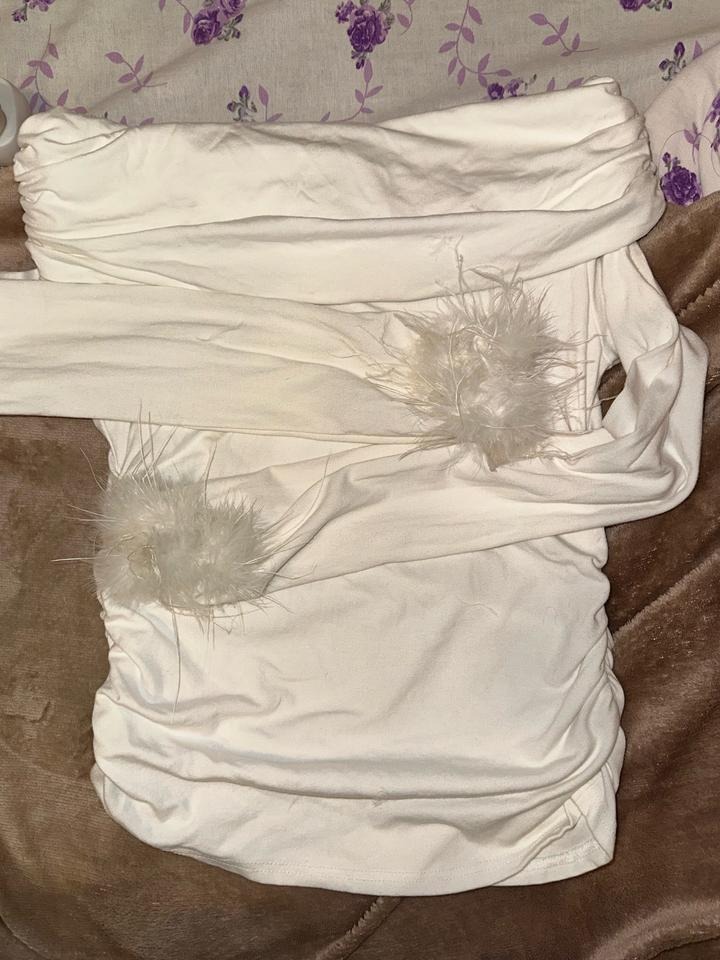 Красивая белая кофта, которая подчеркнет плечи. Состояние 10/10, надевала пару раз. Размер стандарт, подойдет на S,M,L Особенности: перья на рукавах, их можно убрать Артикул: 454579