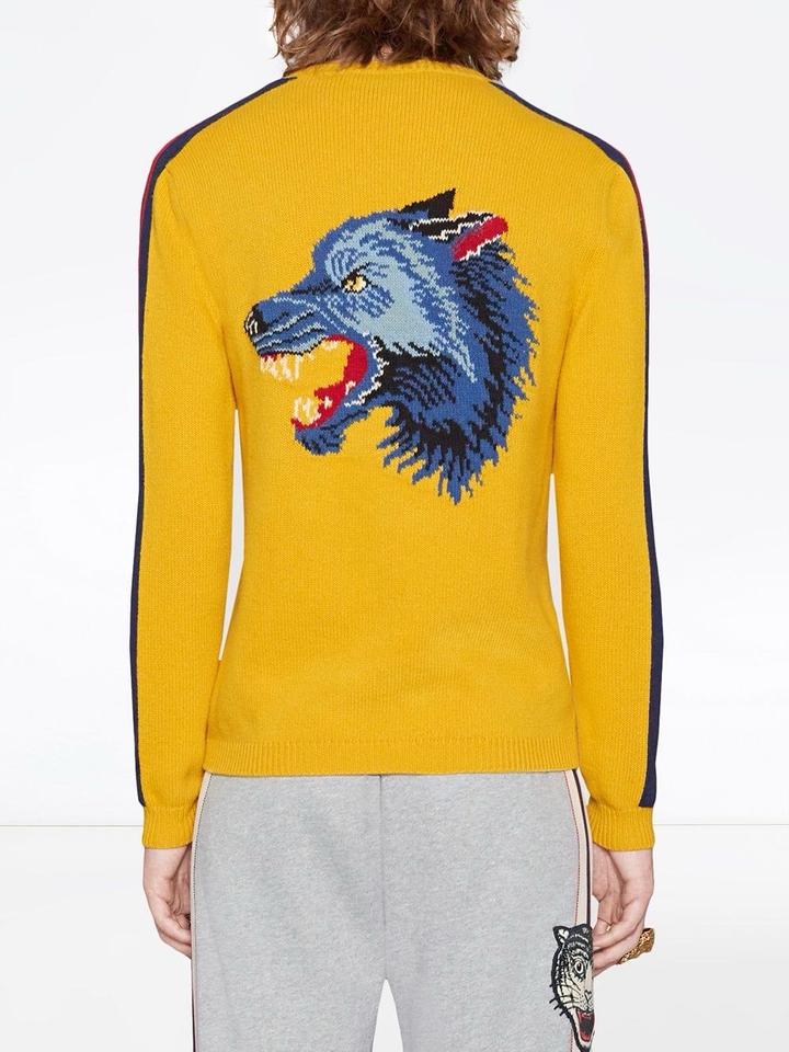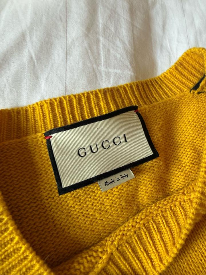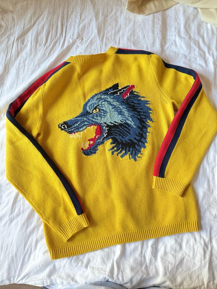 Оригинальный свитер Gucci Blind For Love из знаковой коллекции Alessandro Michele. Насыщенный жёлтый цвет, интарсия с контрастной надписью спереди и эффектной вышивкой волка на спине. Фирменные полосы по рукавам, 100% шерсть, производство Италия. Культовая модель, узнаваемый дизайн и выразительный акцент в образе. Отличное состояние, аккуратная посадка, идеален для стильных повседневных и statement-луков. Артикул: 454609