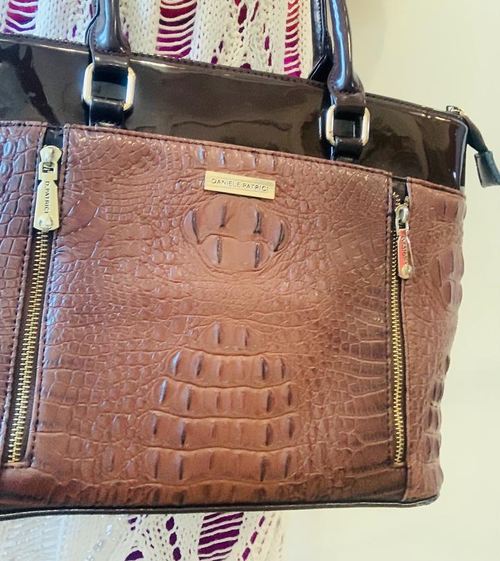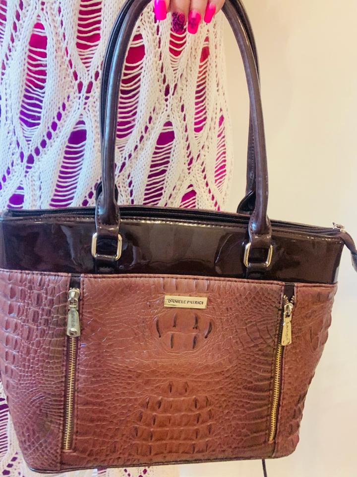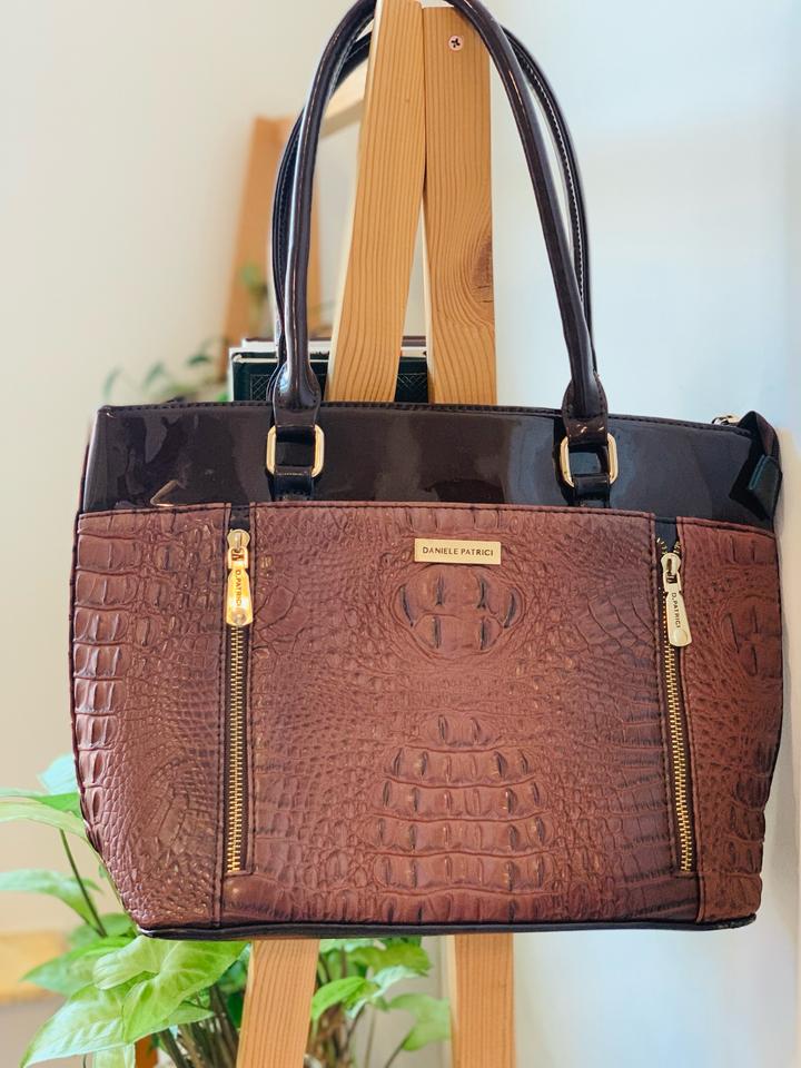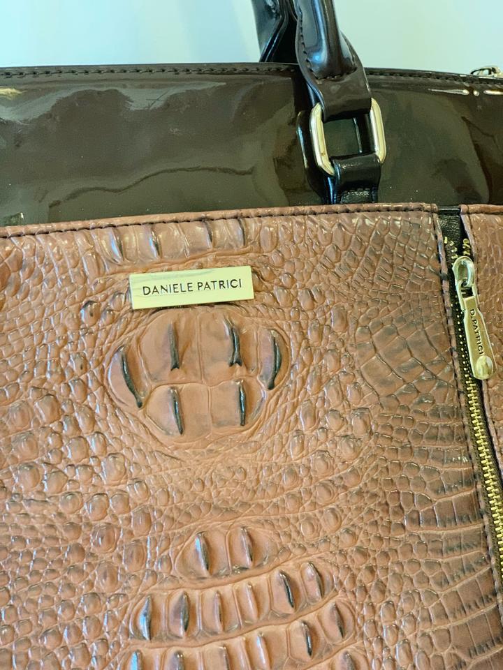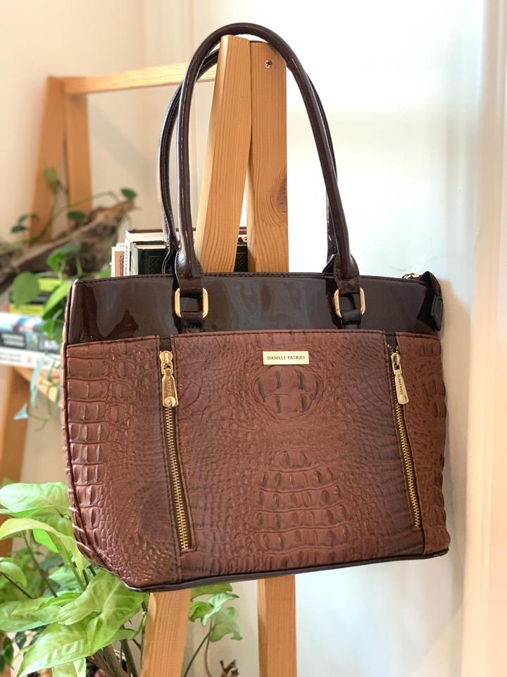 Новая вместительная сумка от Daniele Patrici, есть внутренние карманы, также один внешний на молнии. Комбинация лакированной кожи кофейного оттенка и матовой кожи под крокодила цвета молочного шоколада. Размер 37*27 см без учета ручек. Влезает полноценный А4. Легкая, базовая сумка. Артикул: 455447