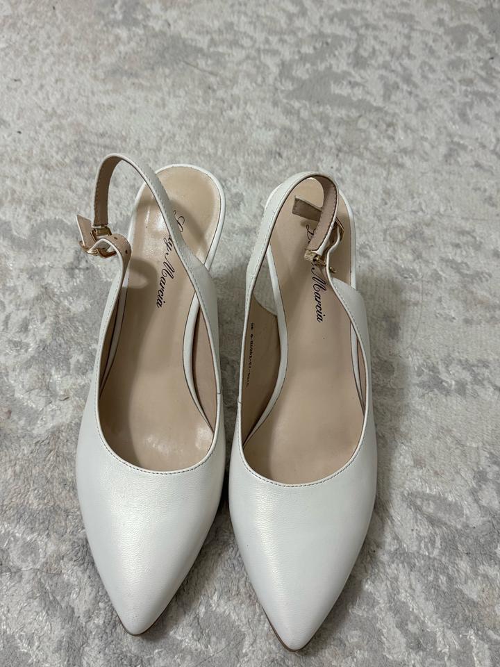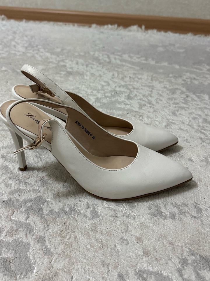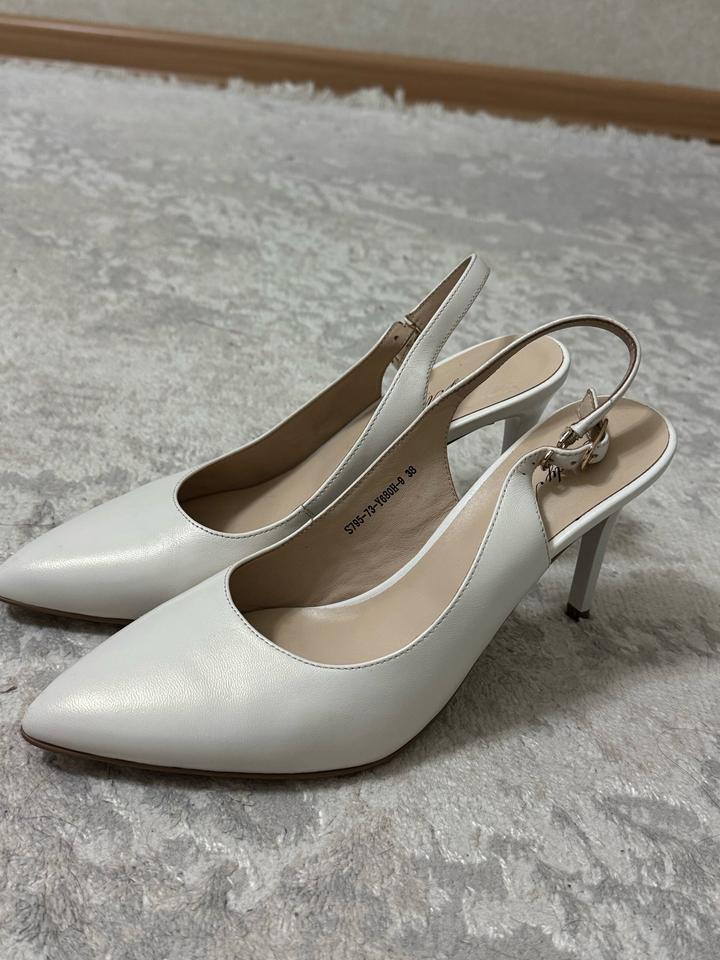 Туфли жемчужно белого цвета с открытой пяткой. Очень удобные. Носила 2 раза на узату и свадьбу. Очень удобные. Артикул: 455960