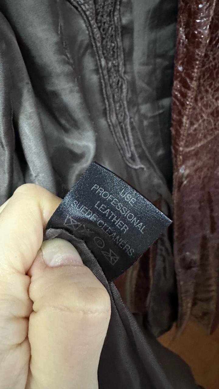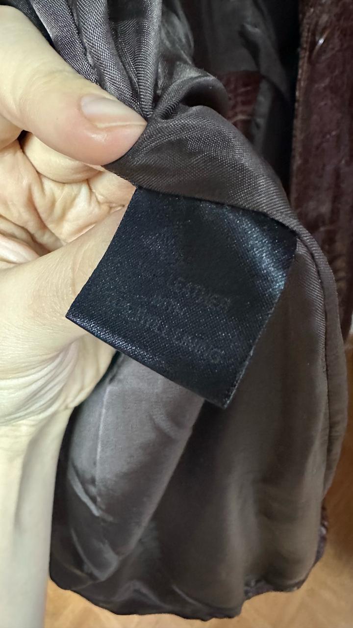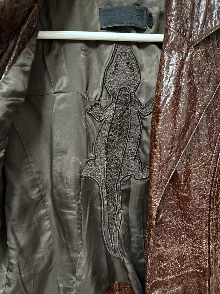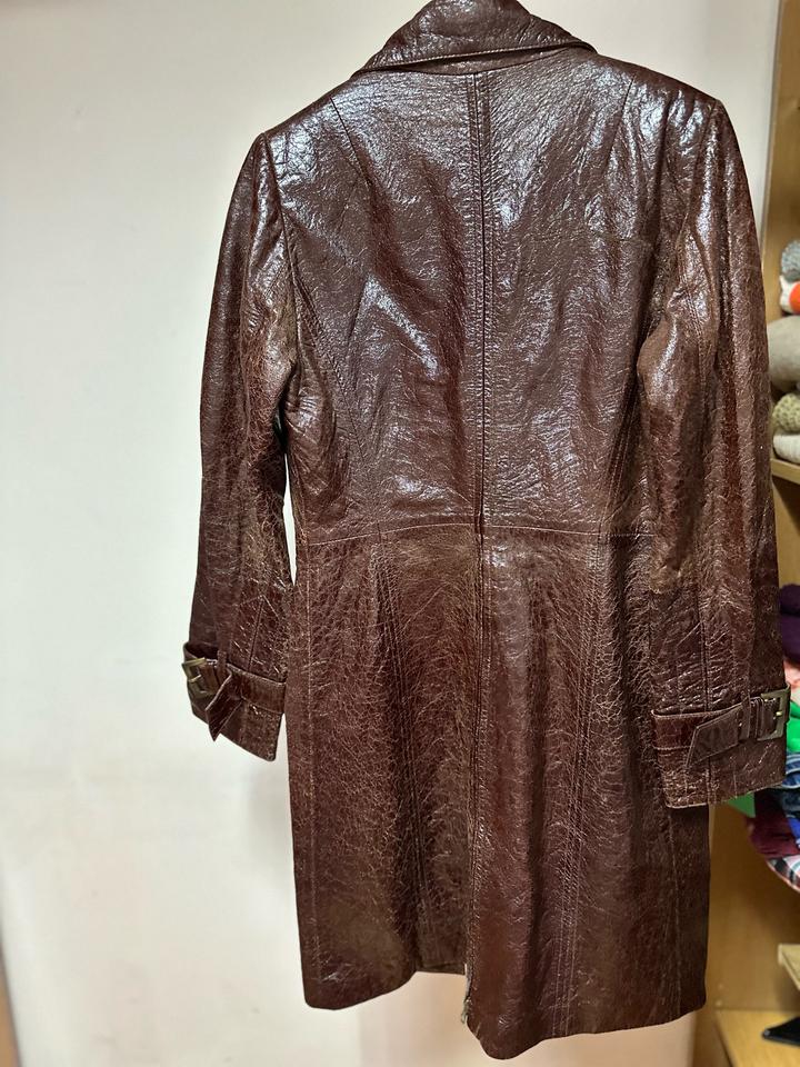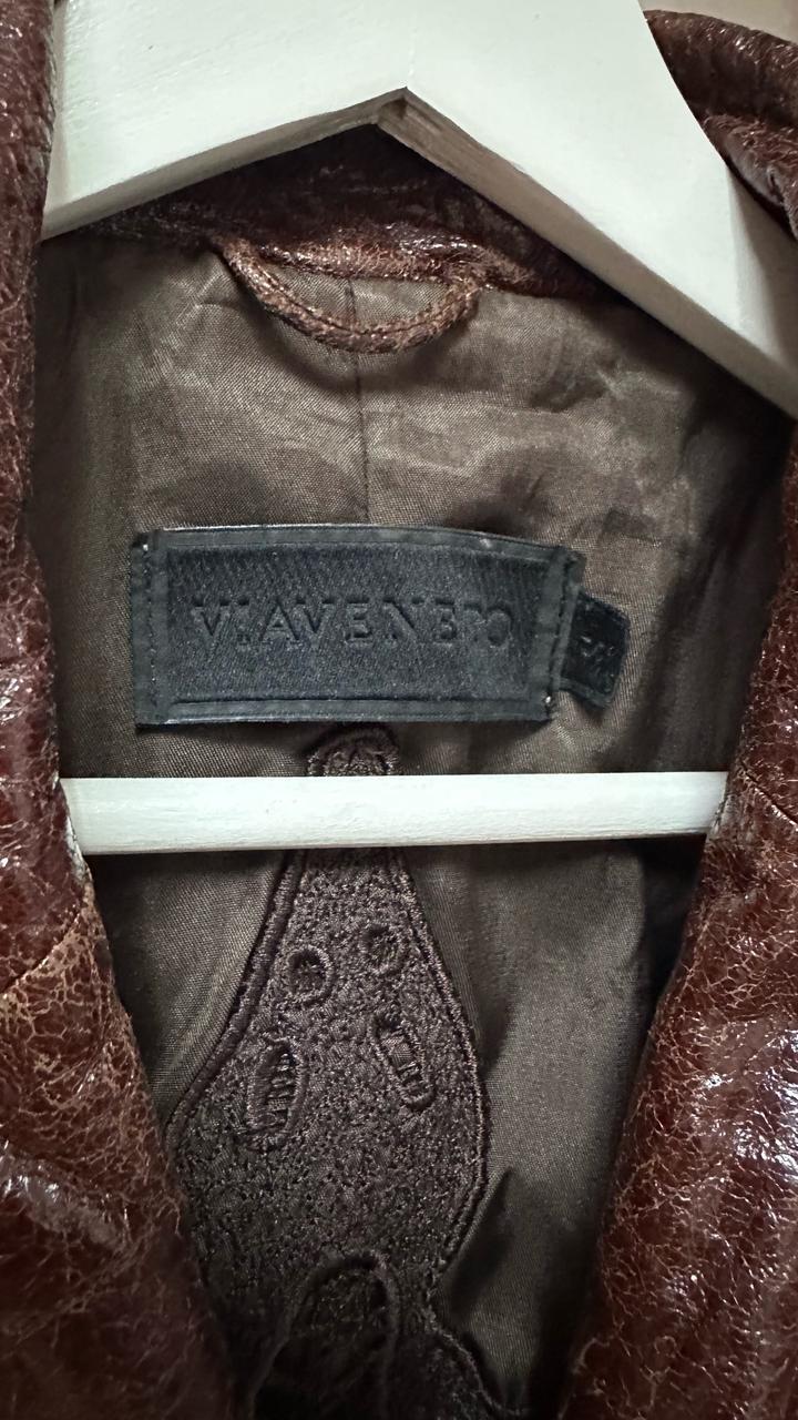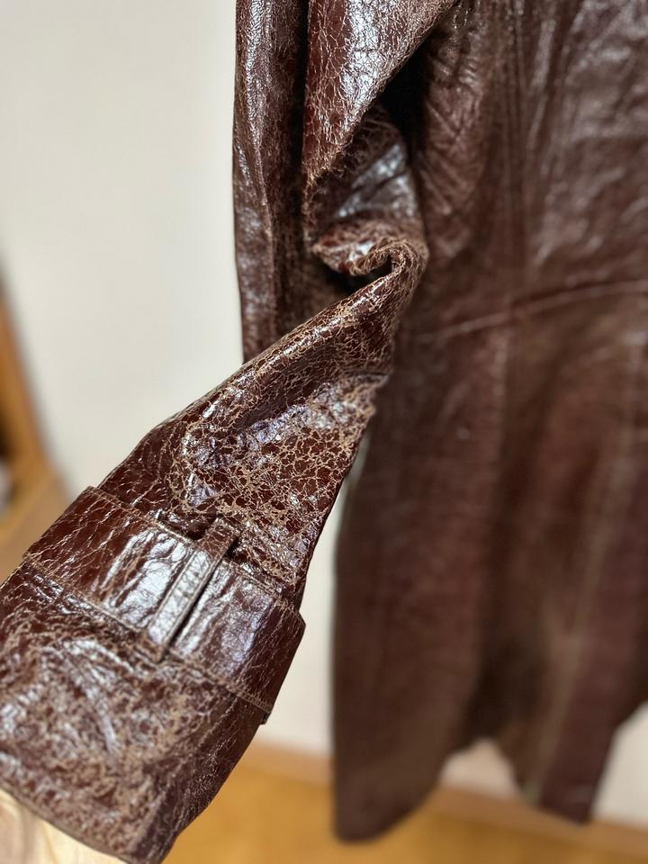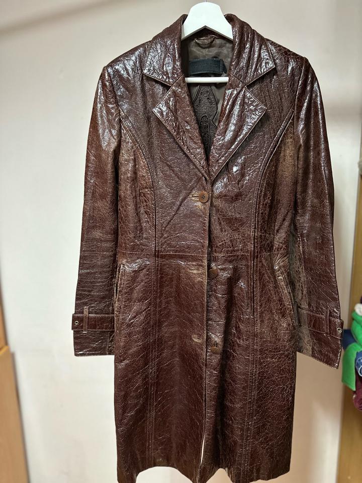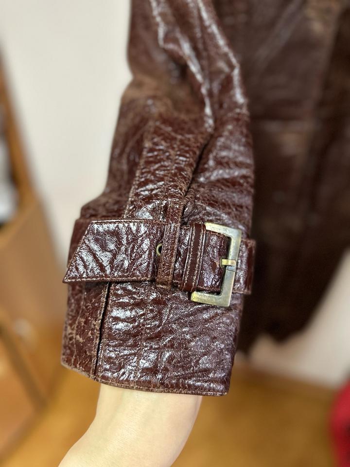 Кожаный винтажный плащ Viavenero, натуральная кожа. Глубокий коричневый оттенок с эффектной фактурой «кракле» — смотрится благородно. Приталенный силуэт, классический воротник с лацканами, застёжка на пуговицы, декоративные ремешки на рукавах. Внутри красивая подкладка с вышивкой. Стильная вещь с характером — для ярких городских образов. Артикул: 456594