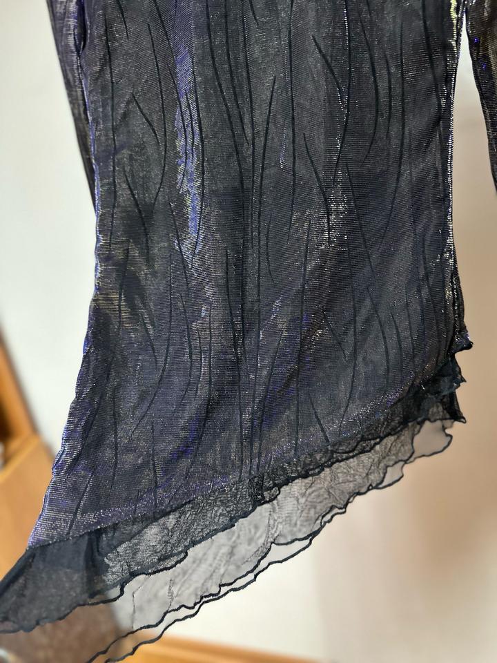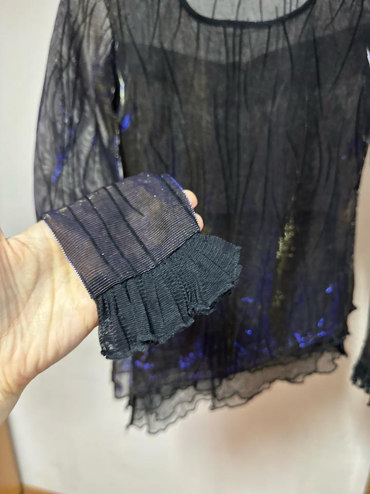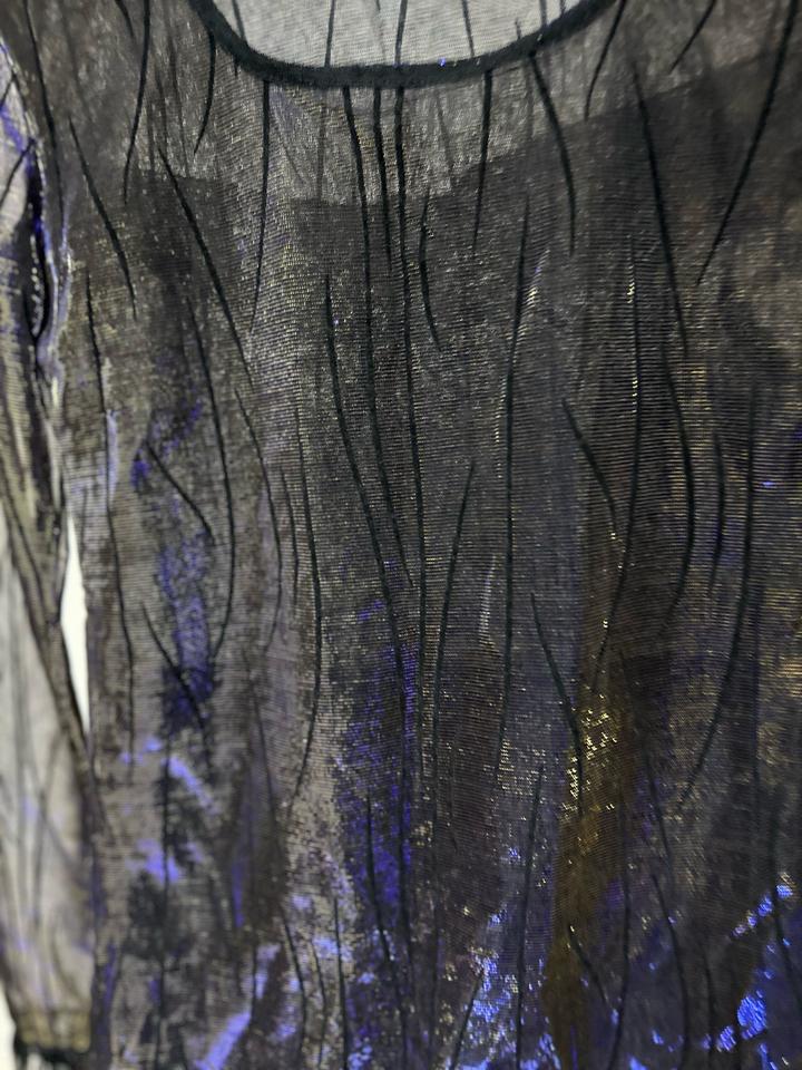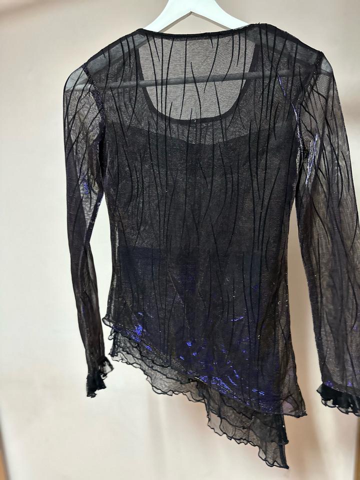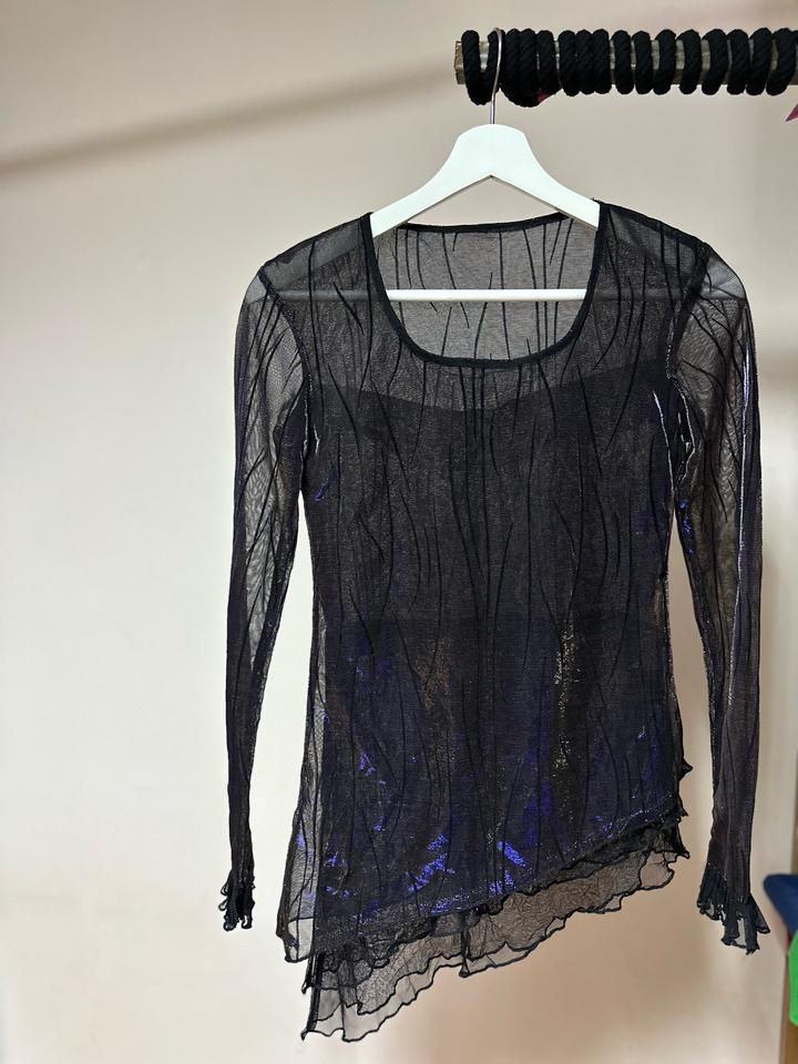 Эффектная модель из тонкой чёрной сетки с деликатным переливом и абстрактным узором. Ассиметричный низ с лёгкой волной и прозрачные рукава создают лёгкий, немного драматичный силуэт. Идеален для layered-образов: носите поверх топа или бра, сочетайте с кожаными брюками, юбкой или джинсами. Отличный вариант для вечернего выхода или стильного casual с характером. Артикул: 456689