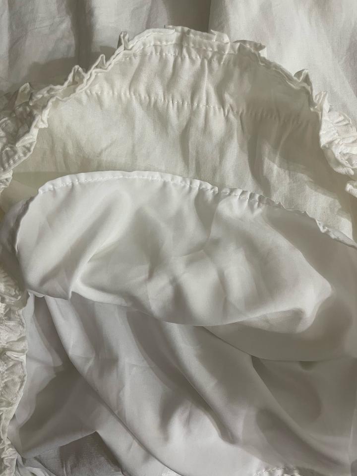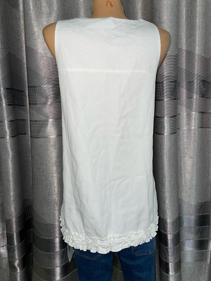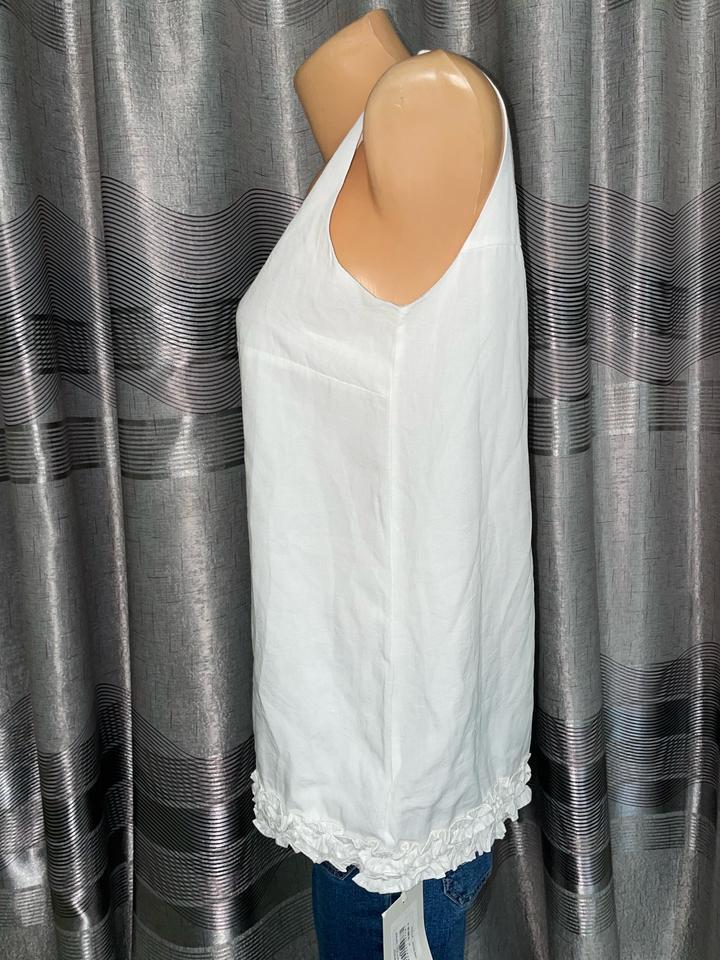 женский белый топ без рукавов с кружевной отделкой по нижнему краю. Материал плотный,есть подклад Качество отличное Артикул: 457154