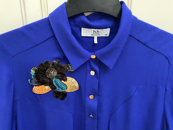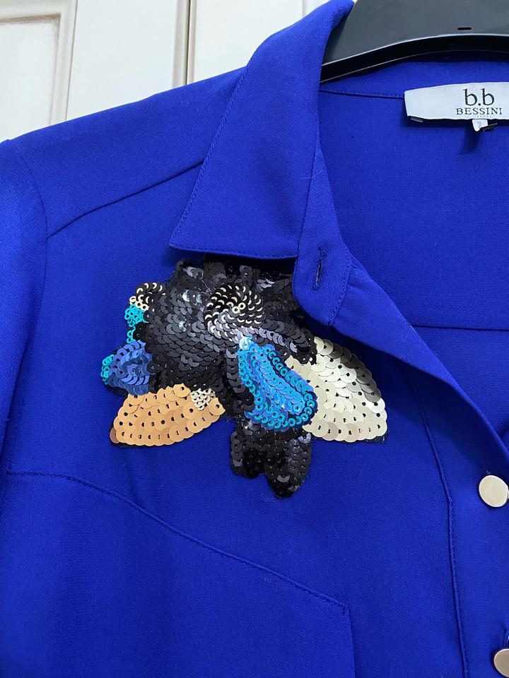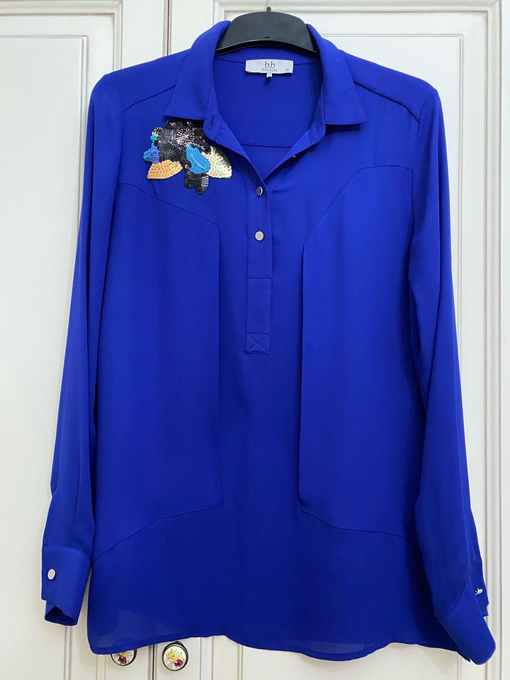 Блузка красивого синего цвета. К сожалению камера не передает глубокий синий цвет. Ткань очень приятная мягкая. Аппликация из пайеток справа. Длина изделия 72 см, длина рукава 62 см. Артикул: 457353