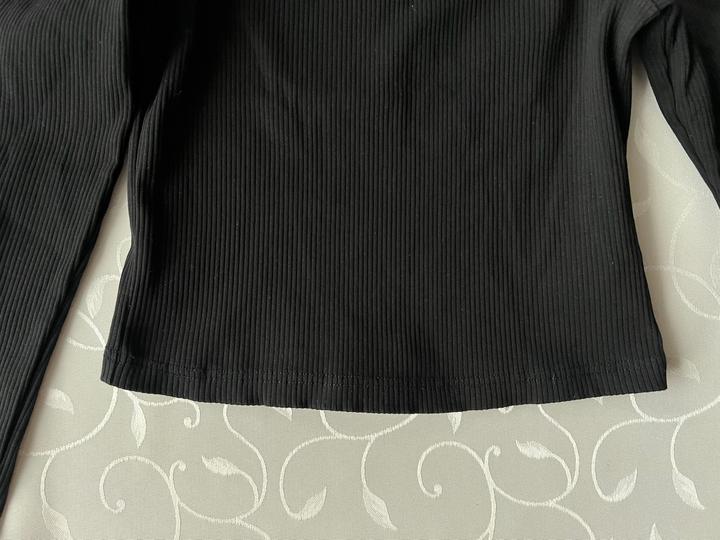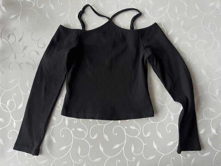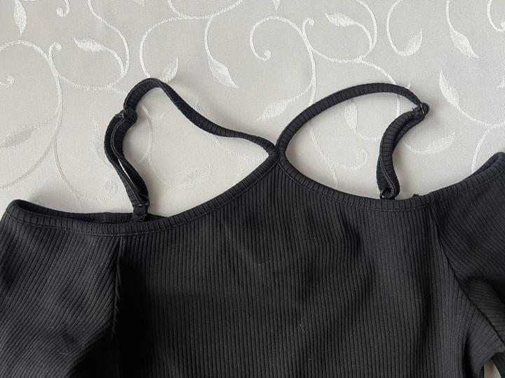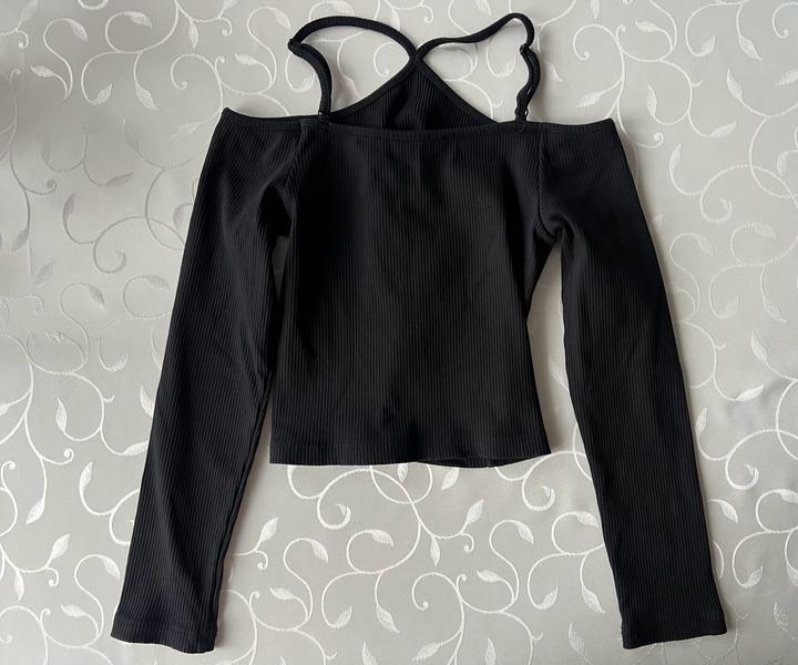 Черный кроп топ в рубчик м длинными рукавами со спущенными плечами. Эффектно смотрится из-за детали на шее. Новый, размер М Артикул: 457746