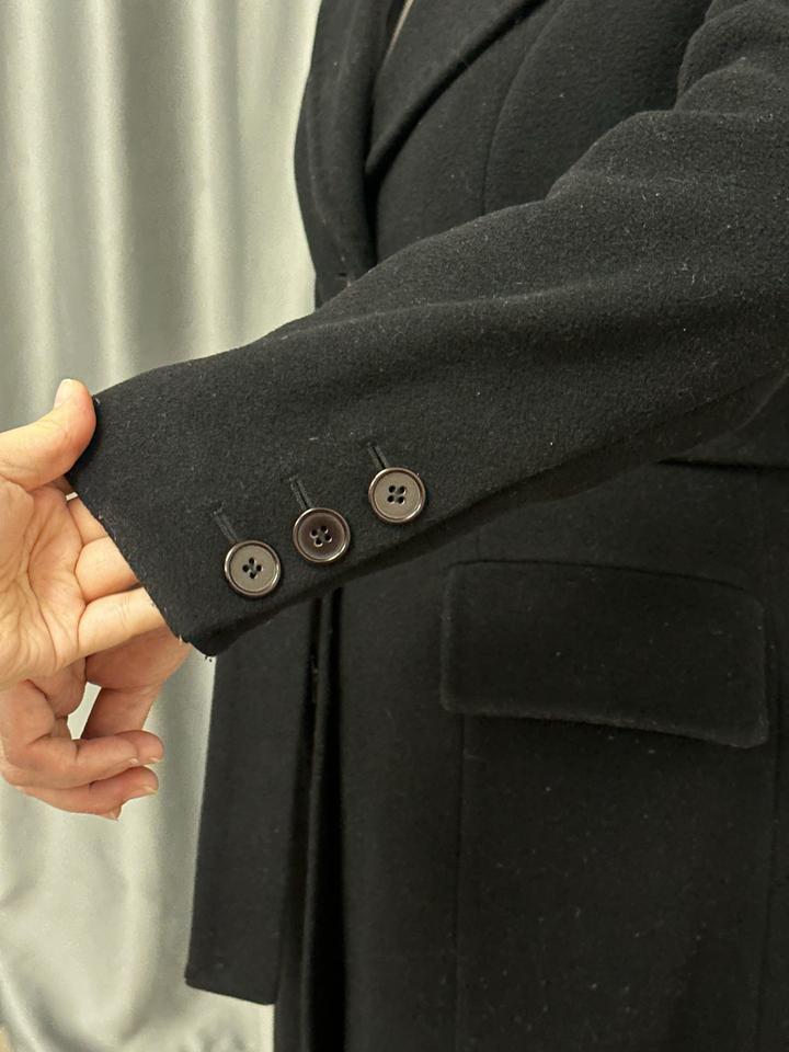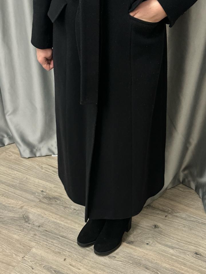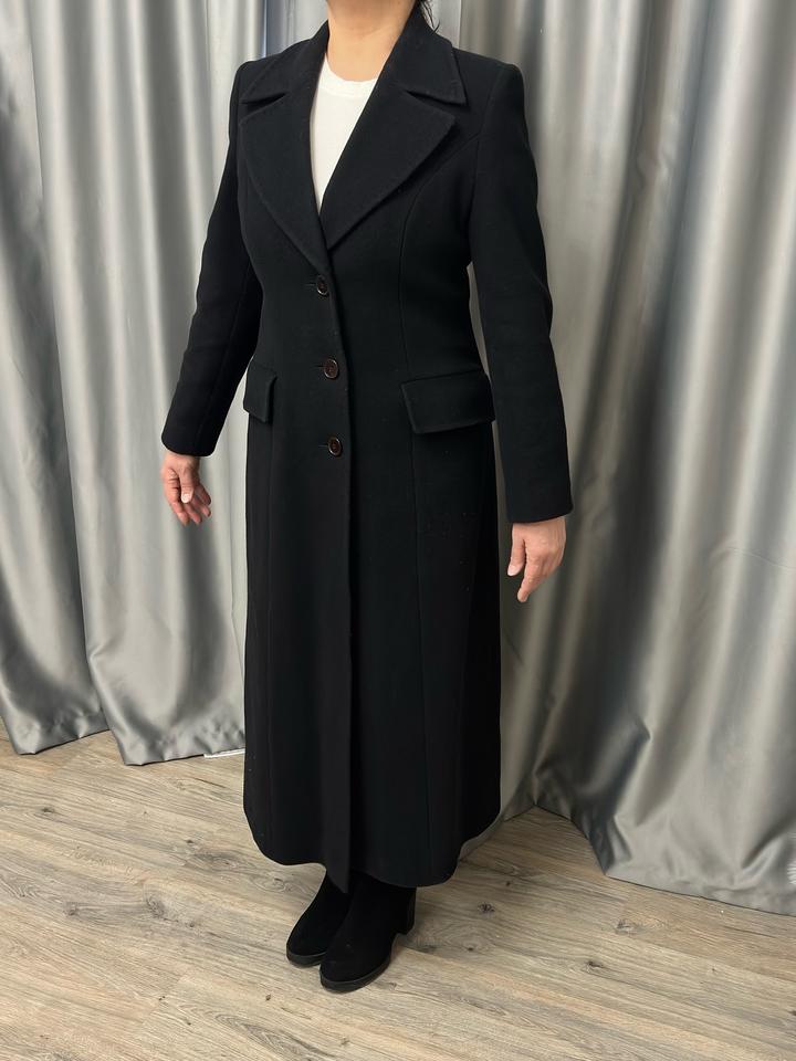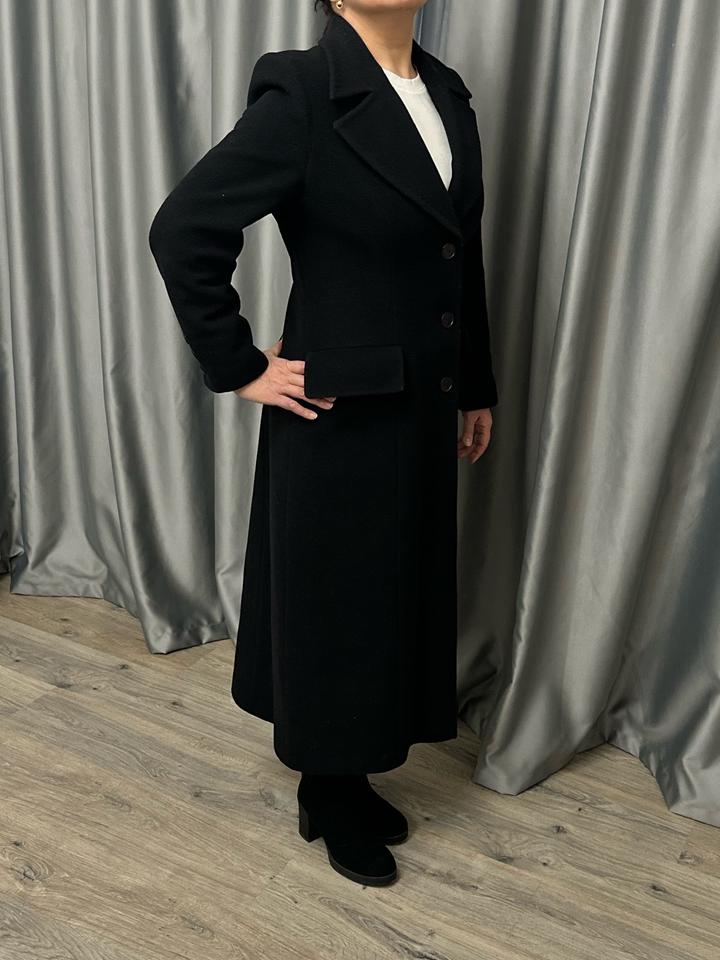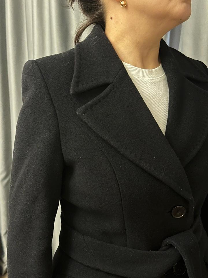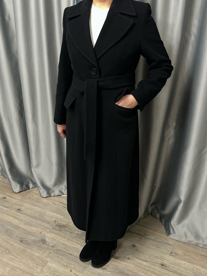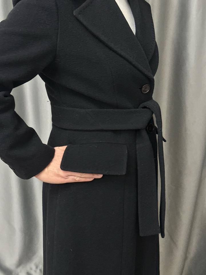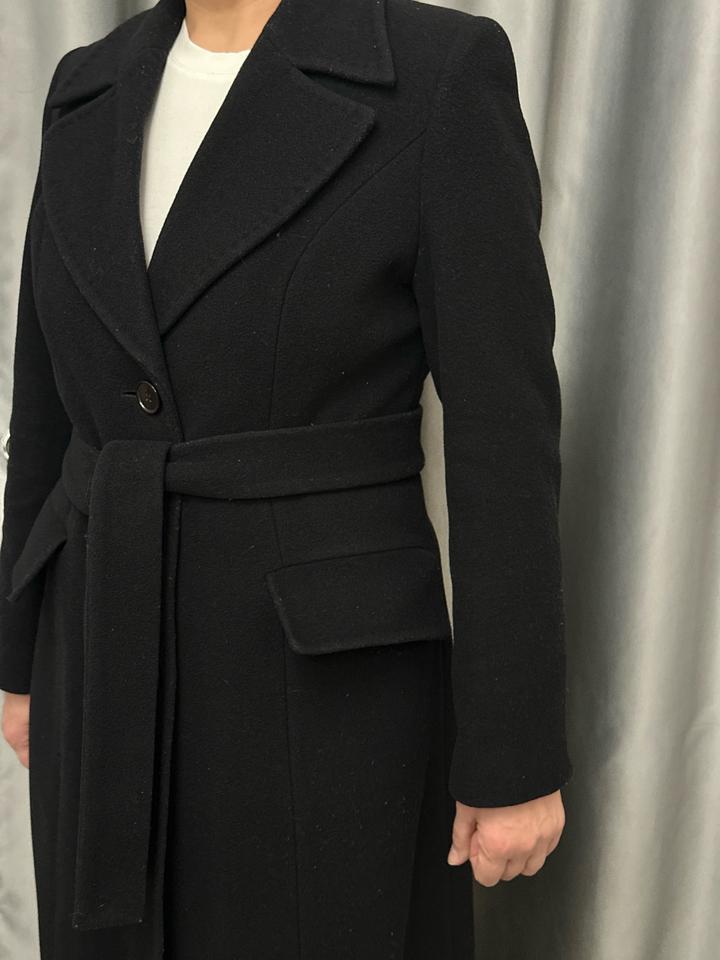 Черное пальто из шерсти. Сезон: осень-весна Размер: 44-46 Материал: Шерсть Длина: 125 см Модель: приталенная с ремешком Артикул: 457867