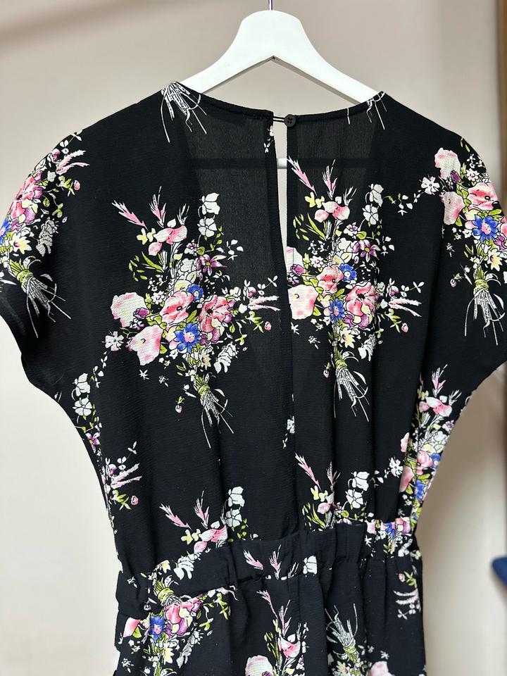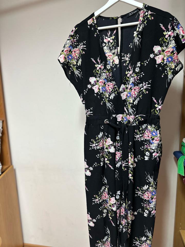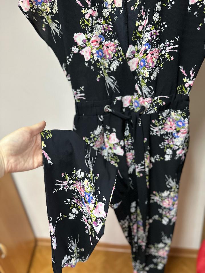 Комбинезон с цветочным принтом — женственный и универсальный вариант на каждый день и для особых случаев. Чёрная база с нежными букетами создаёт выразительный контраст, а V-образный вырез красиво подчёркивает линию декольте. Пояс на кулиске акцентирует талию и регулирует посадку. Лёгкая струящаяся ткань комфортна в носке. Отлично сочетается с босоножками, кедами или каблуком. Артикул: 458434