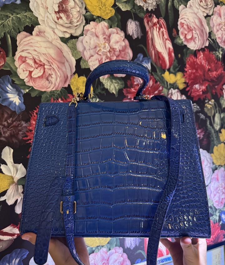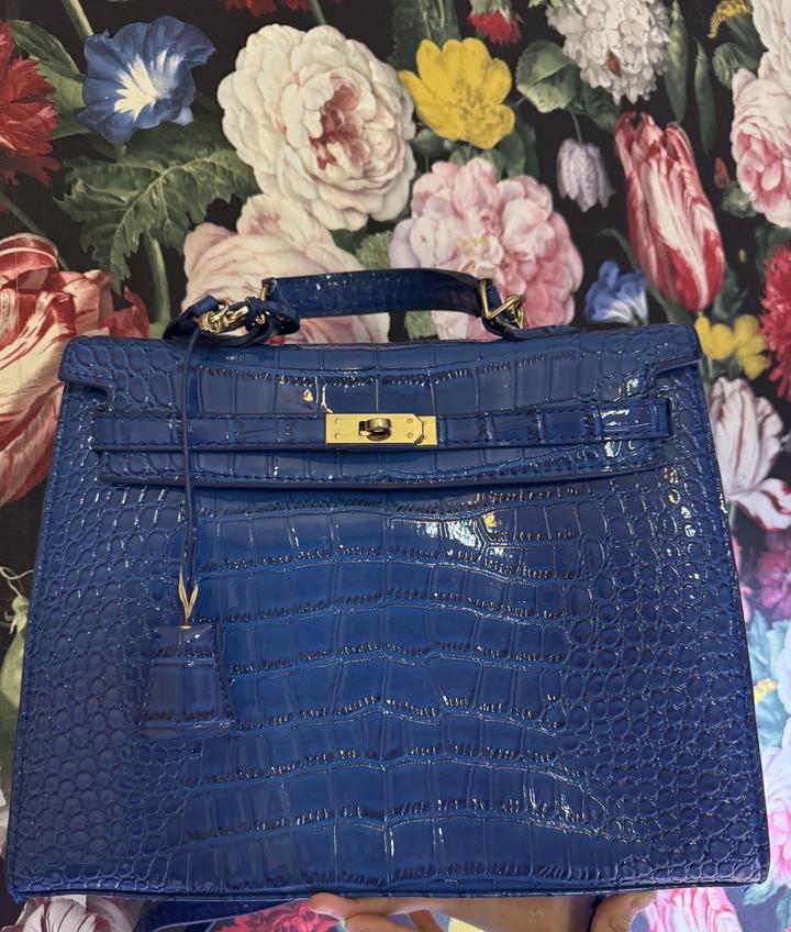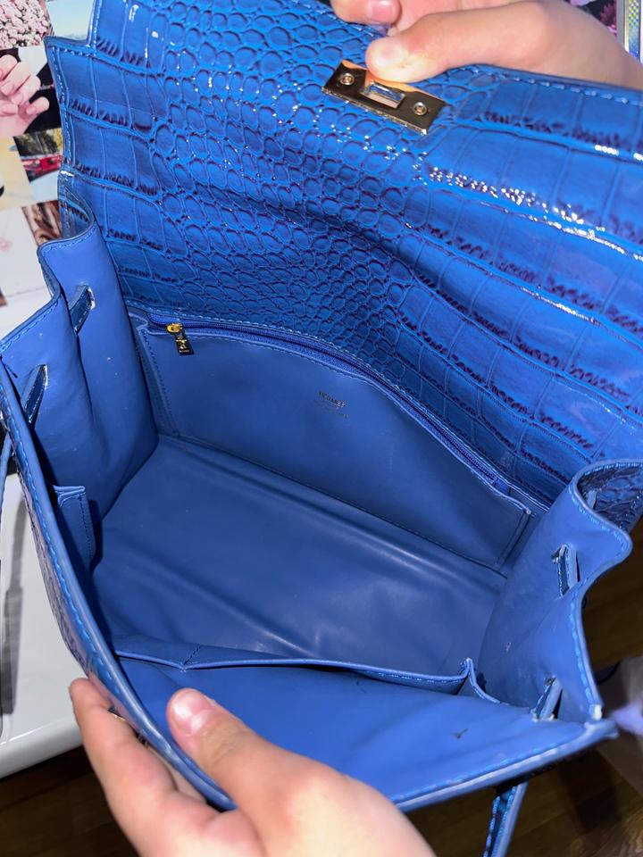 Ношеное, синяя сумка с лаковой фактурой под крокодила. Золотистая фурнитура, удобная короткая ручка. Классическая статусная модель, отлично дополнит элегантный образ. Артикул: 458472