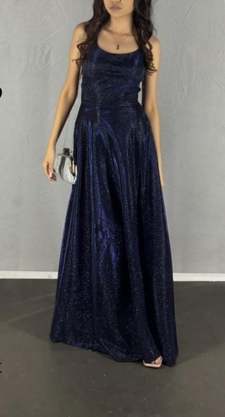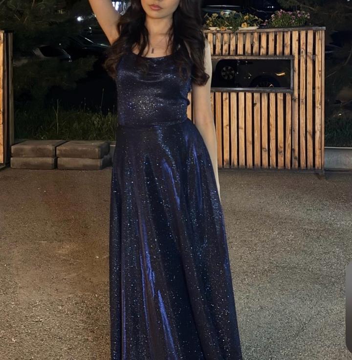 Это длинное вечернее платье тёмно-синего (navy) цвета с мерцающим эффектом, будто усыпанное мелкими блёстками — при свете выглядит как звёздное небо Артикул: 460008