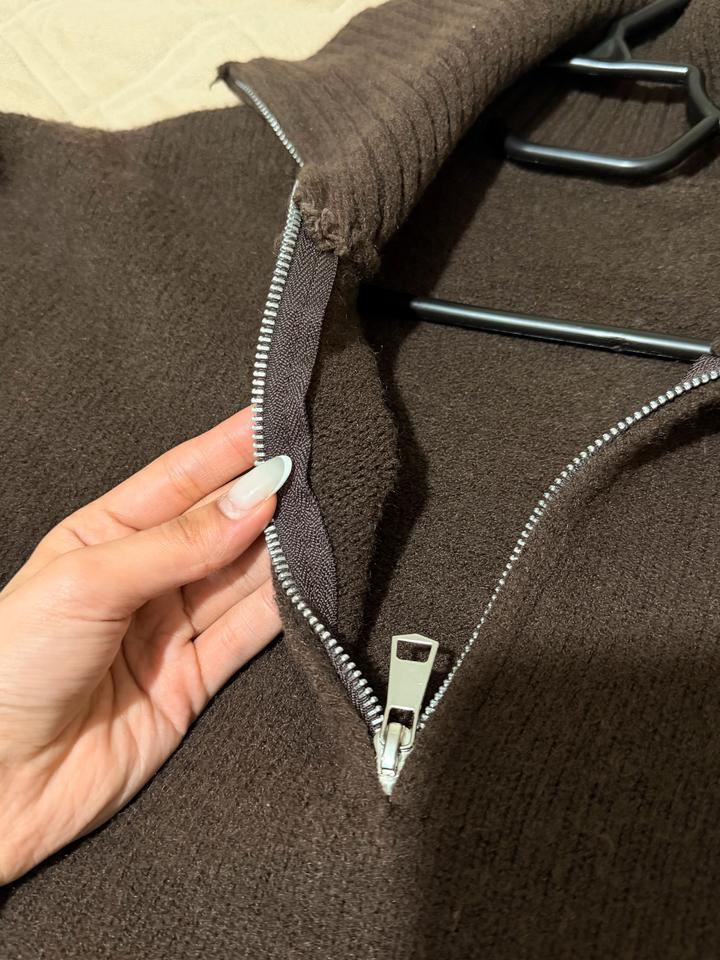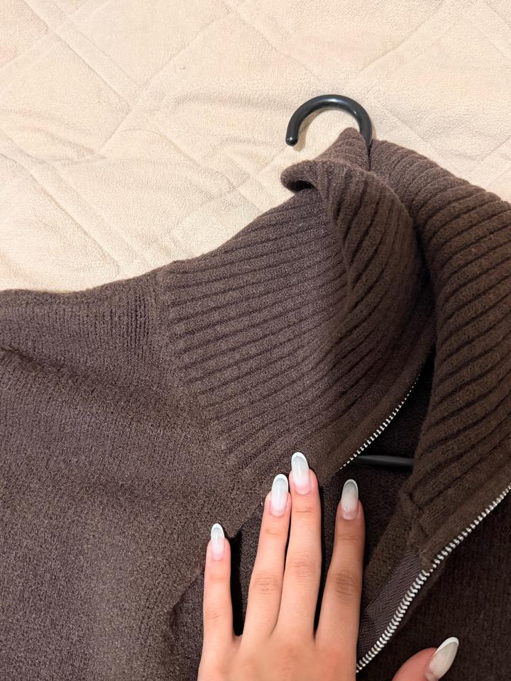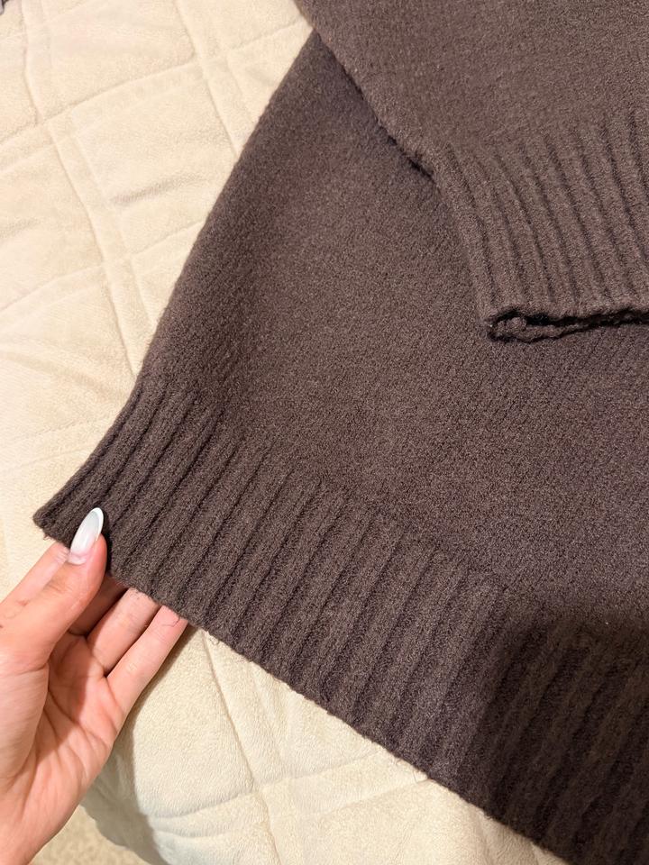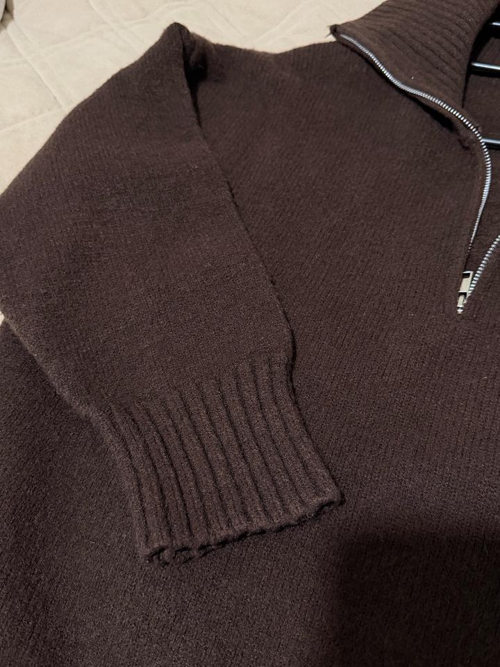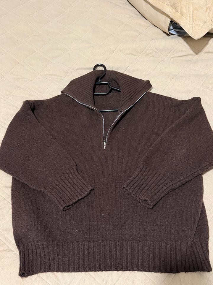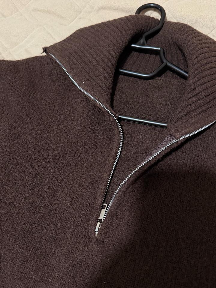 Тёплый вязаный свитер(полузамок) шоколадного оттенка. Модель с высоким воротником на молнии (можно носить расстёгнутым или закрытым), удобный свободный крой. Плотная вязка, мягкий и комфортный в носке.Отличный вариант на весну,осень и зиму! хорошо сочетается с джинсами, брюками и юбками. подойдет S-M в осень хорошем состоянии Артикул: 460365