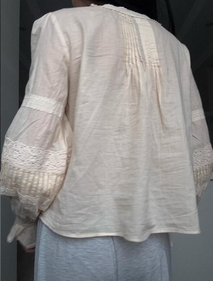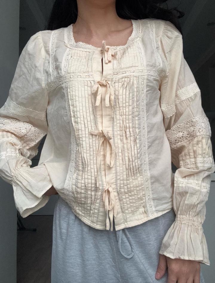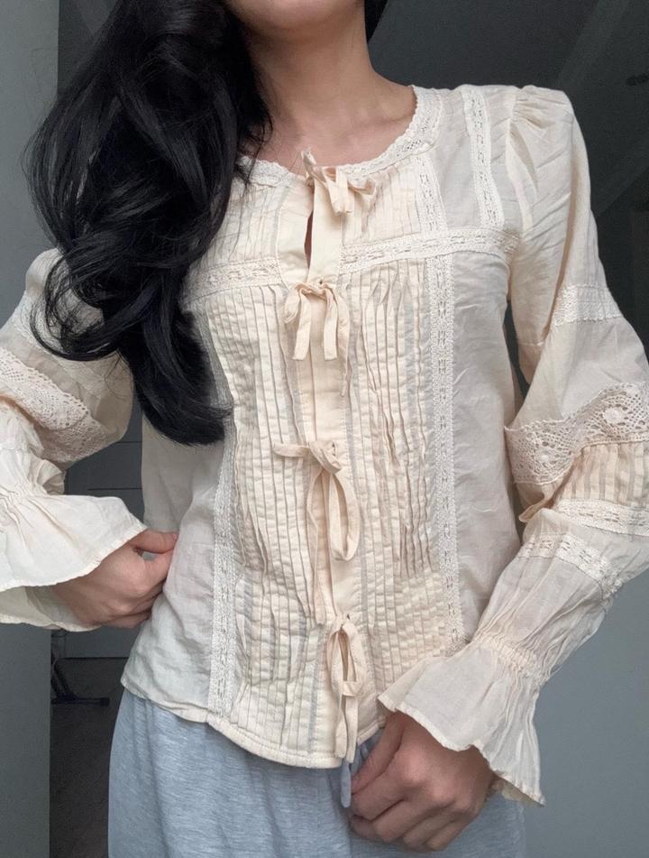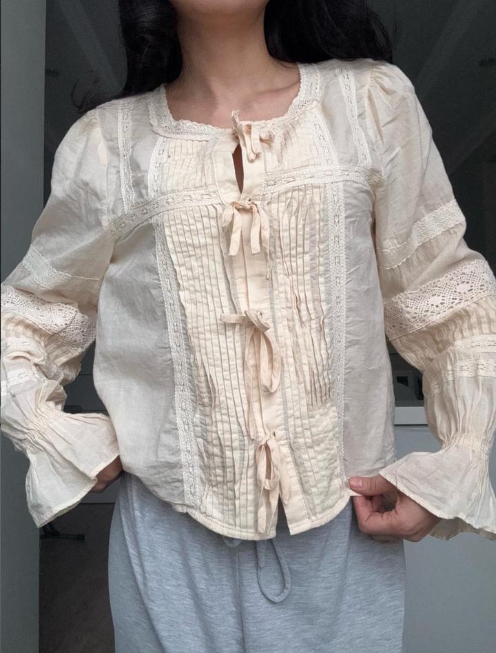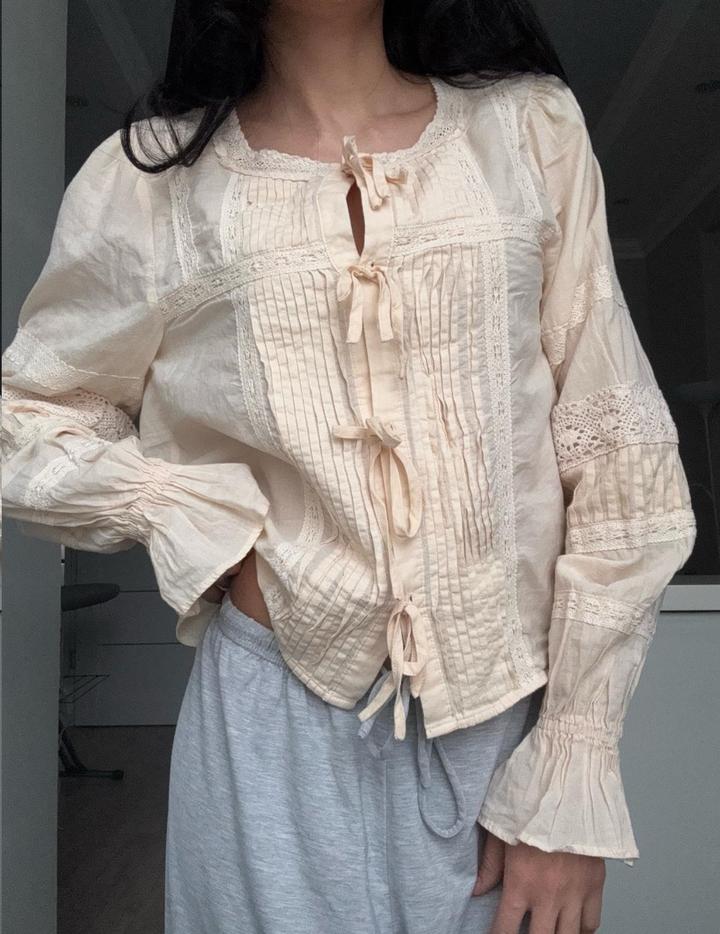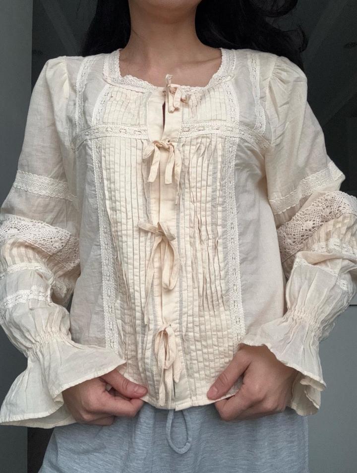 Нежная блуза в винтажном стиле из лёгкой ткани молочного оттенка с декоративными защипами и кружевными вставками. Модель украшена завязками спереди и объёмными рукавами с манжетами, создающими романтичный силуэт. Артикул: 462053