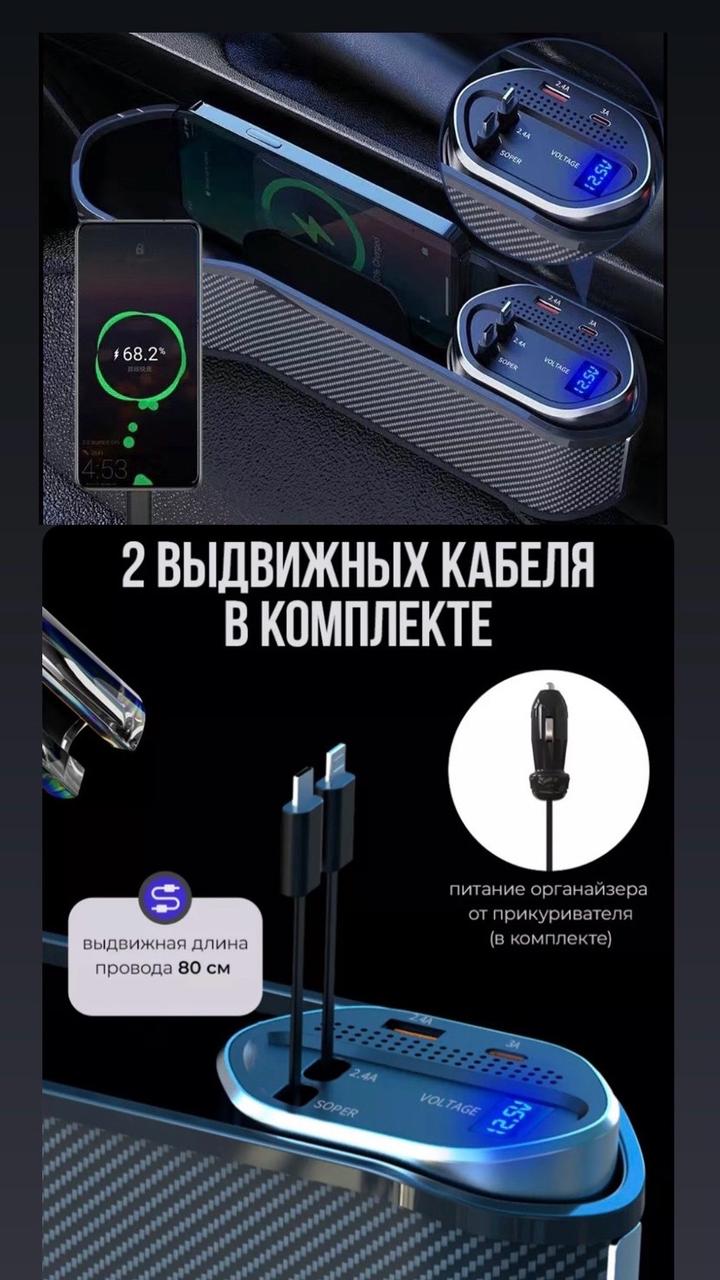 Органайзер для авто с беспроводной зарядкой и с зарядкой для iPhone и Android. Улучшите комфорт и функциональность вашего автомобиля с помощью стильного Органайзера для авто на сиденье с беспроводной зарядкой в карбоновом дизайне! Этот органайзер для машины обеспечит отличное хранение для вашего телефона, ключей, карт, денег и других мелочей во время поездок. Кроме того, он оснащен подстаканником для напитков, чтобы вы могли наслаждаться своим любимым напитком в пути. Артикул: 462963