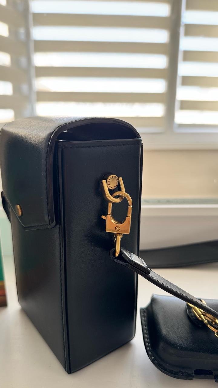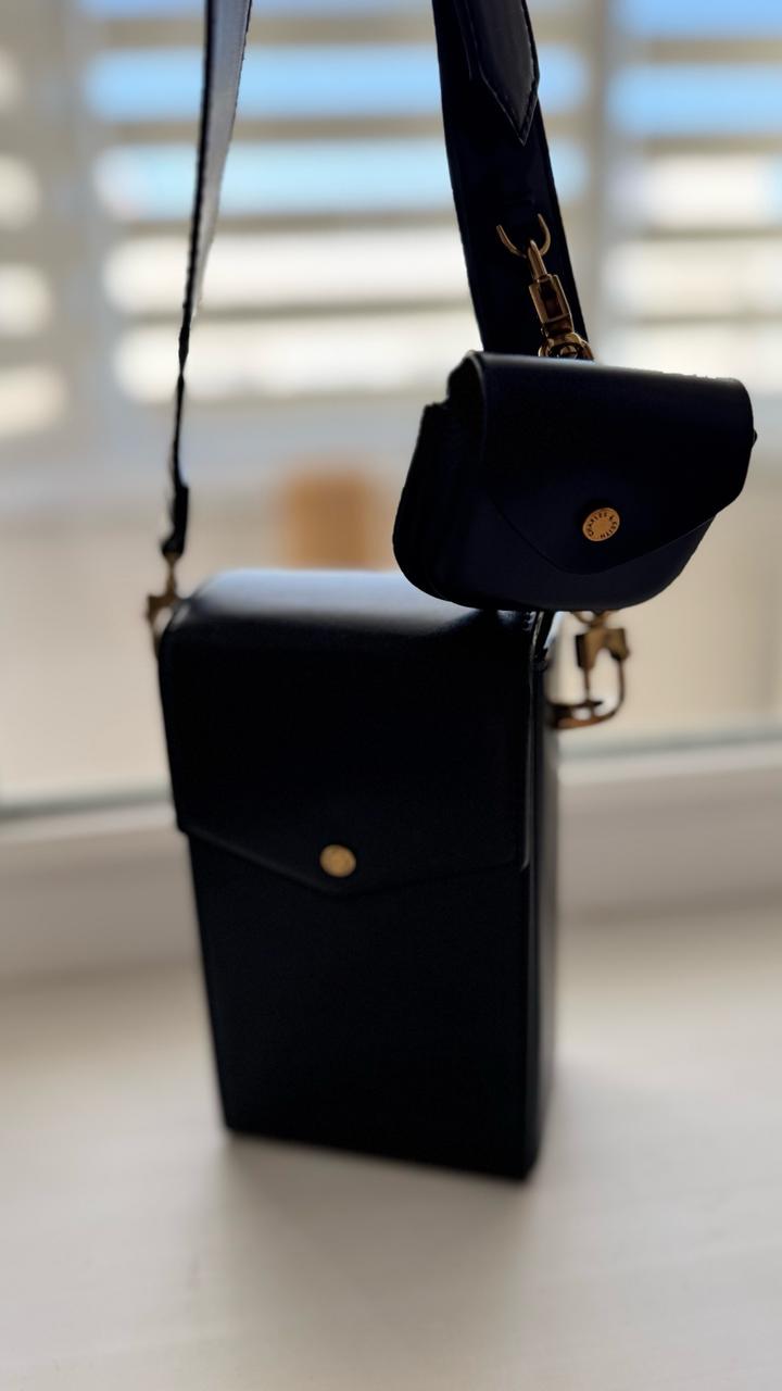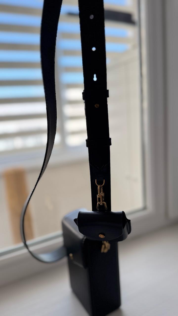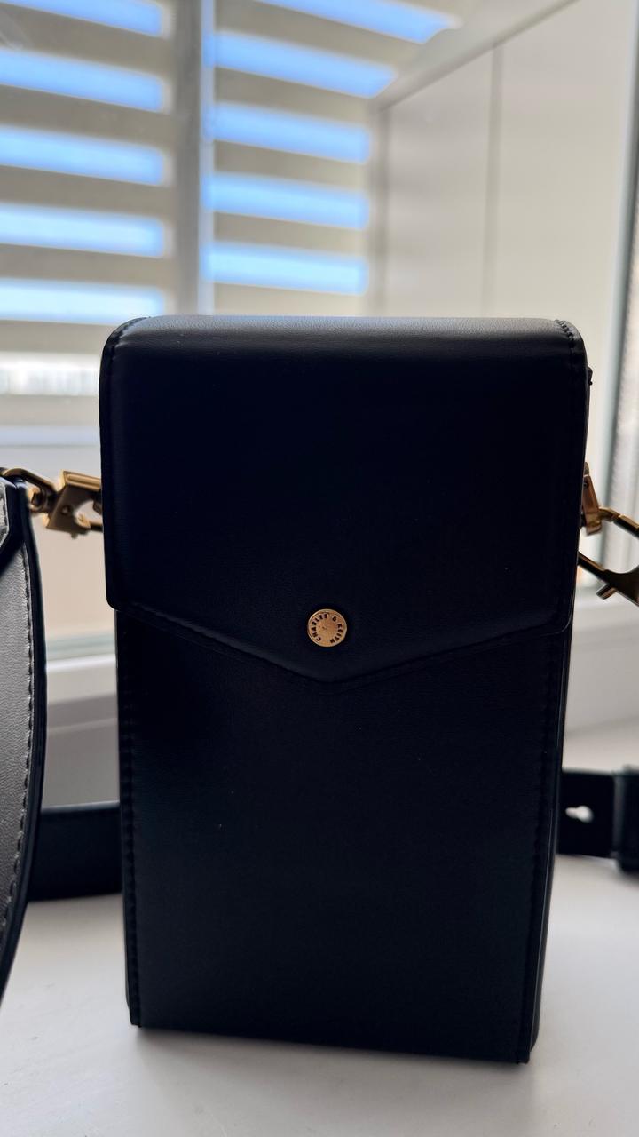 Черная сумочка почтальонка.Телефон и всякая мелочь влезает.Чехол для наушников,можно отстегнуть.Ремешок регулируется Артикул: 463447