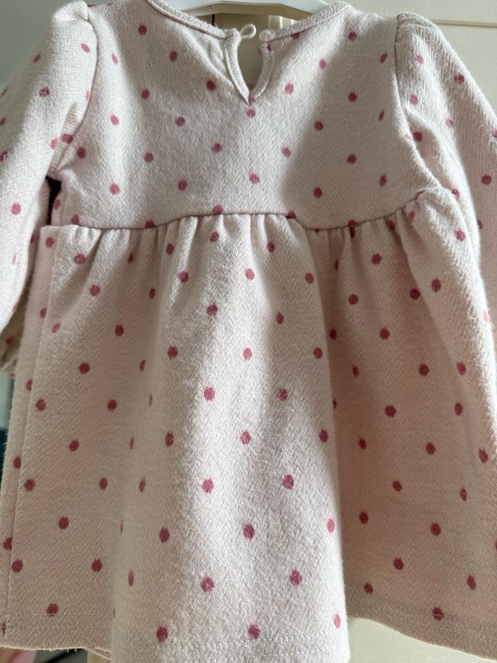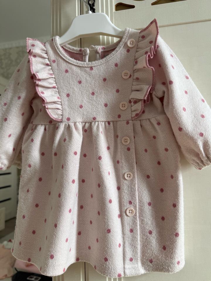 детское теплое платье от бренда Mayoral, в розовом цвете в горошек с рюшами, одевали пару раз Артикул: 463546