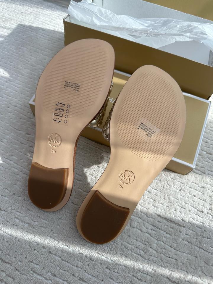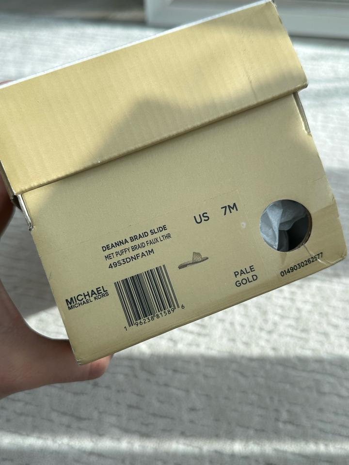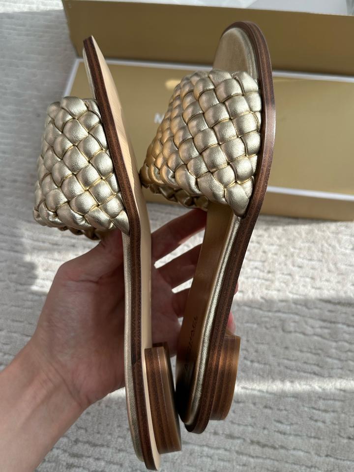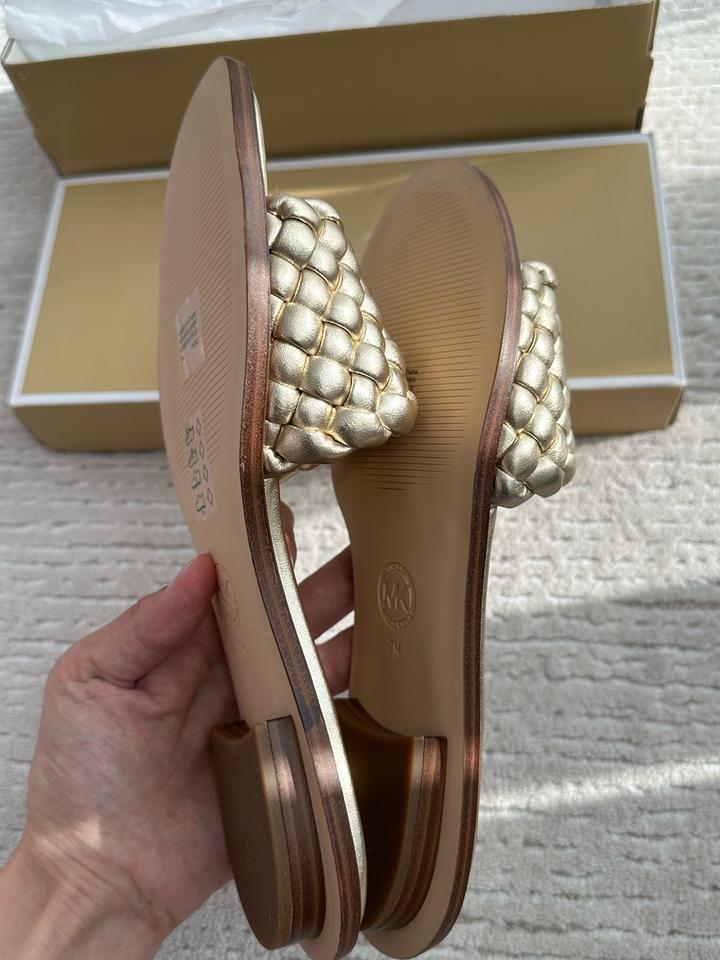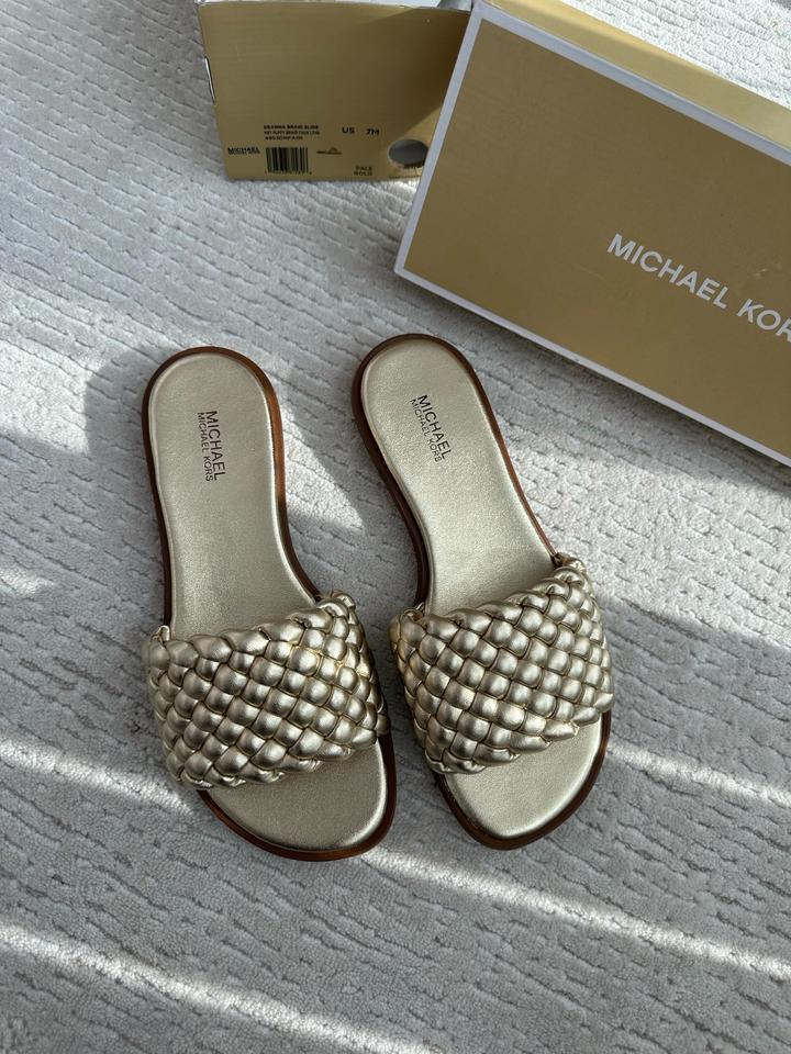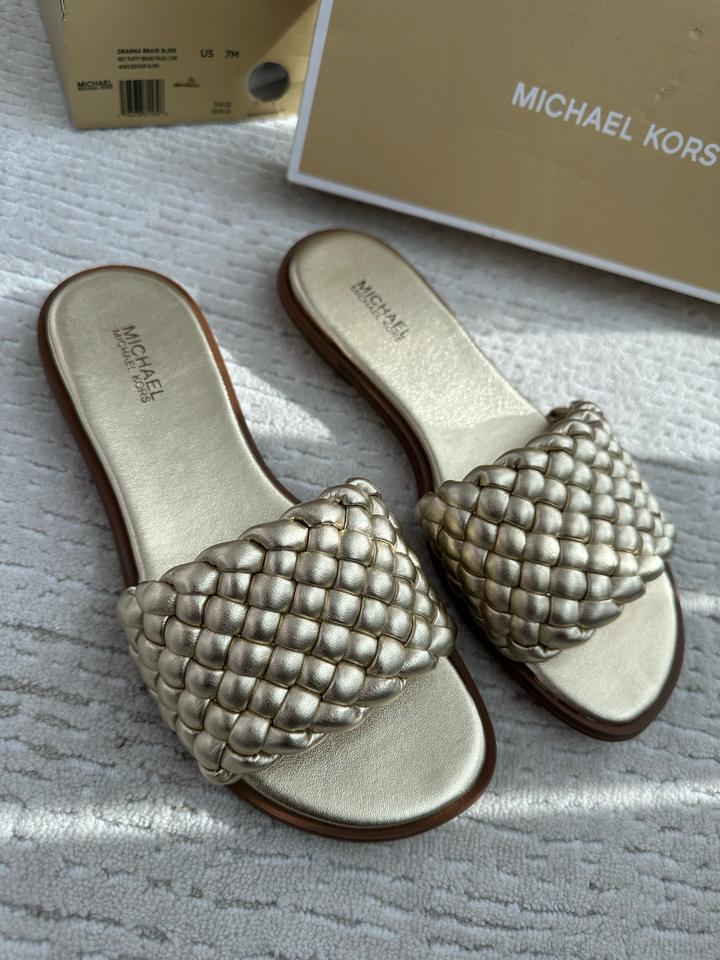 Женские шлепанцы (сандалии-слайды) от бренда Michael Kors. Новые! Оригинал! Натуральная кожа с металлизированным напылением. Это стильная и универсальная летняя обувь, которая хорошо подходит как для пляжного отдыха, так и для городских прогулок Размер 37,5-38 Артикул: 463580