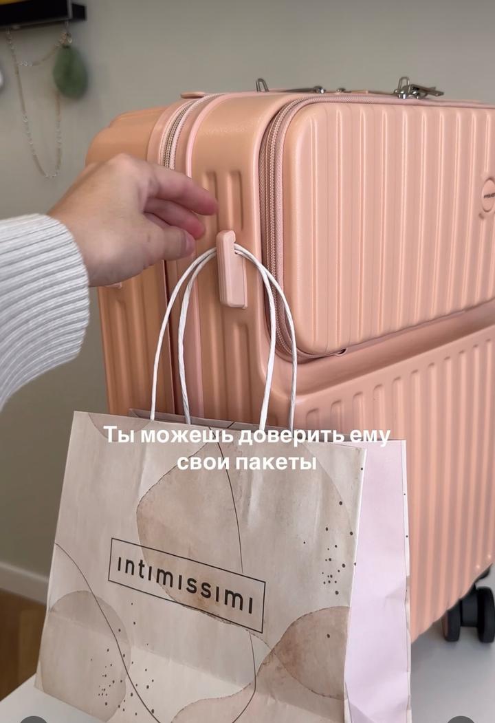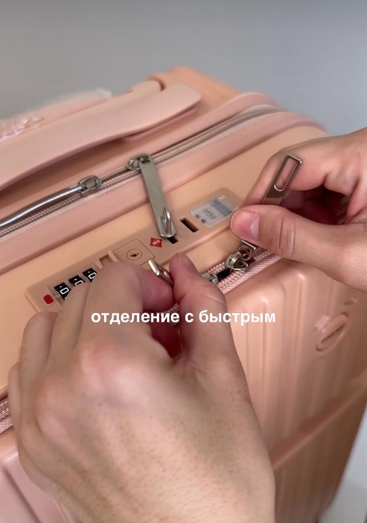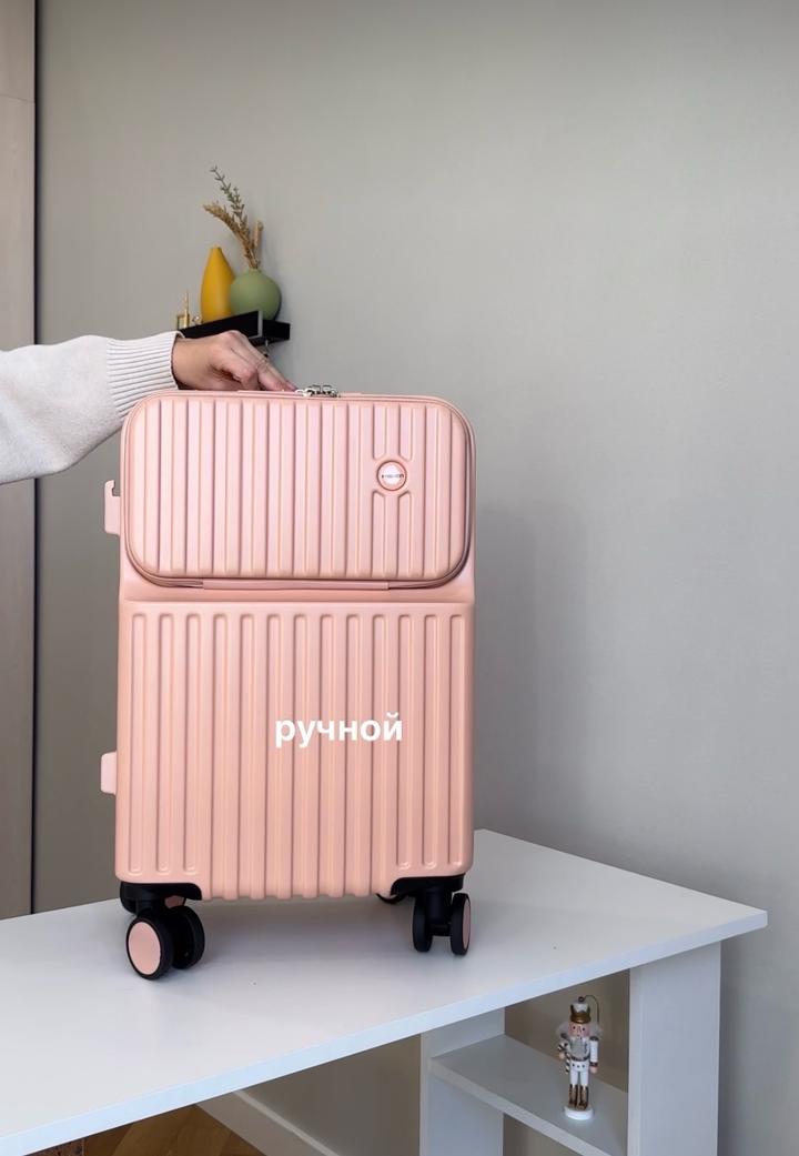 Розовый чемодан для ручной клади. Есть крючки для пакетов, отделения для макбука, держатель для напитка Артикул: 464342