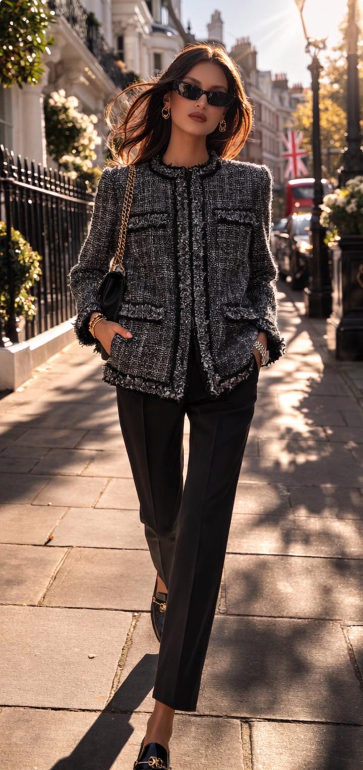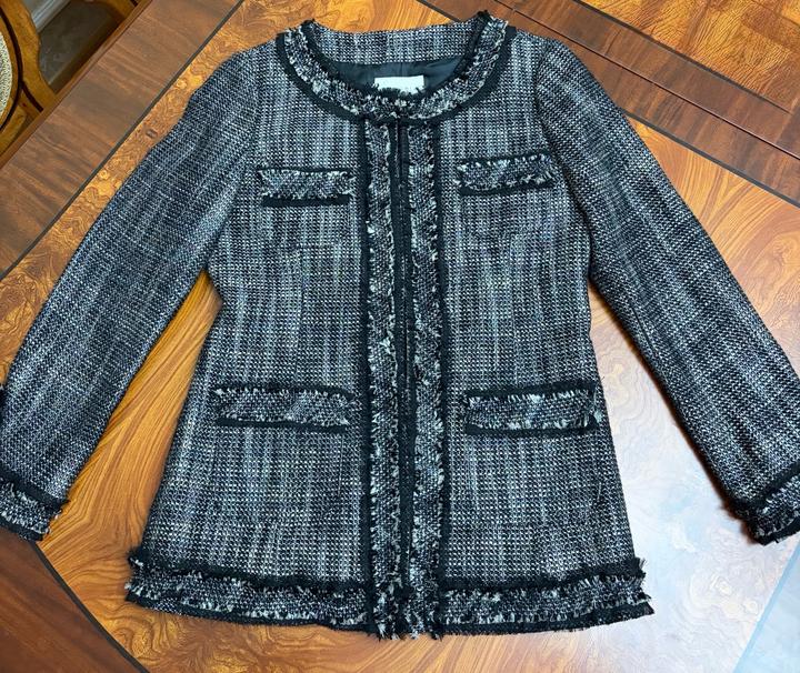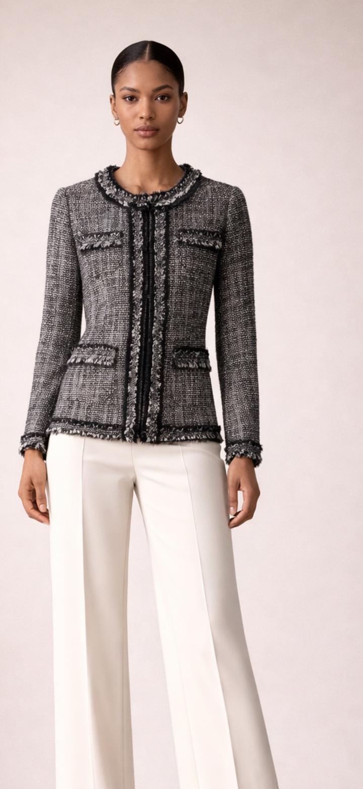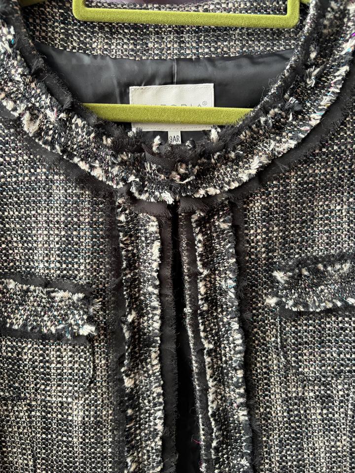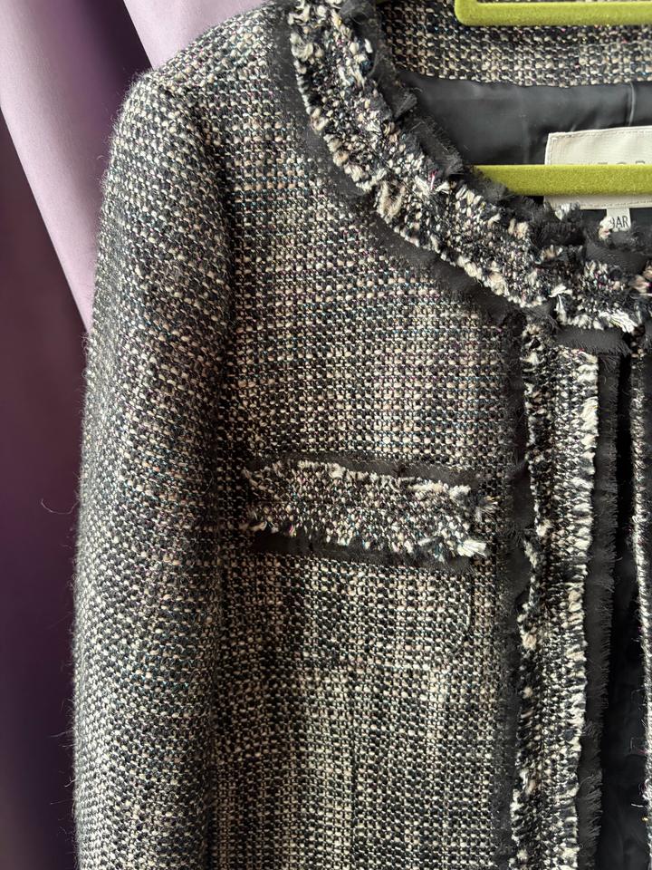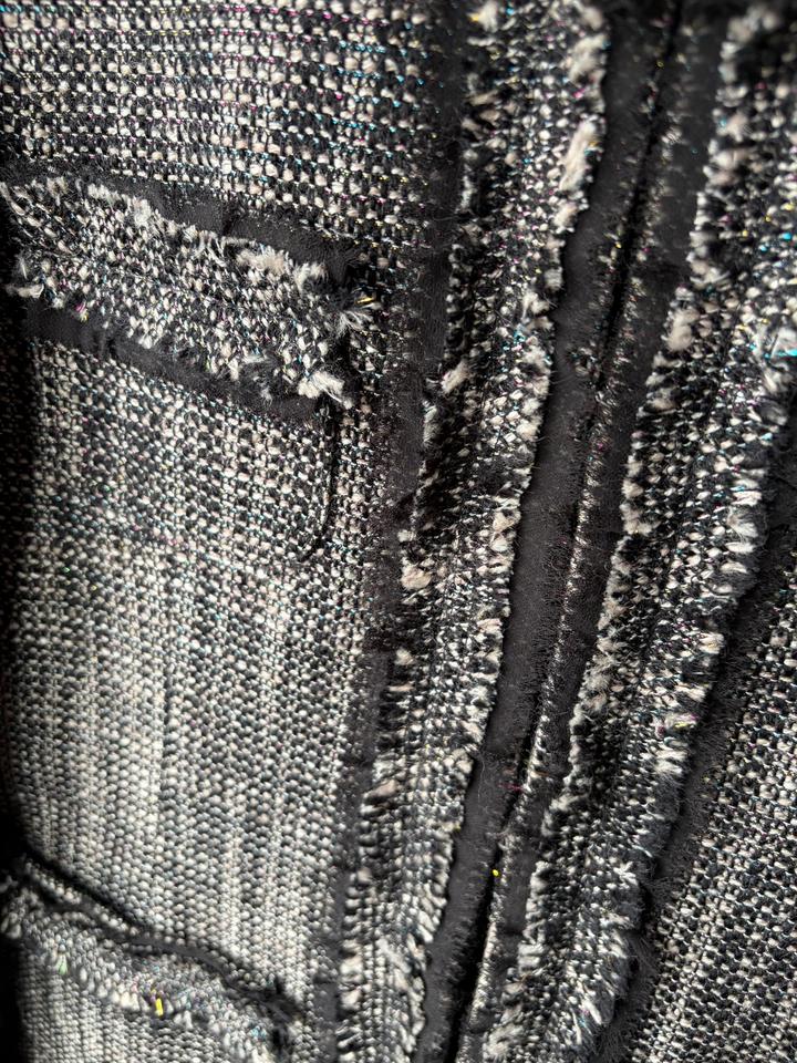 Жакет из твида в стиле Chanel, прямого кроя, классический, с мягкой линией плеч, без воротника. Фактурный смесовый твид чёрно-серой гаммы с меланжевым эффектом и ниткой люрекса. Декоративная бахрома по краям, вдоль борта, манжетам и по низу. Скрытые центральная застёжки. Длина рукава 57 см, длина жакета 64 см. Артикул: 464768