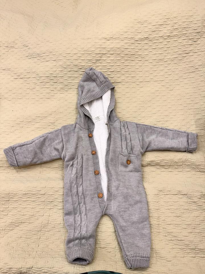 Тёплый вязаный комбинезон на демисезон, подойдёт на осень или весну. Можно носить как самостоятельный верх в тёплую погоду или как слой под куртку. Есть пара небольших пятен Размер: 9 месяцев Артикул: 465666