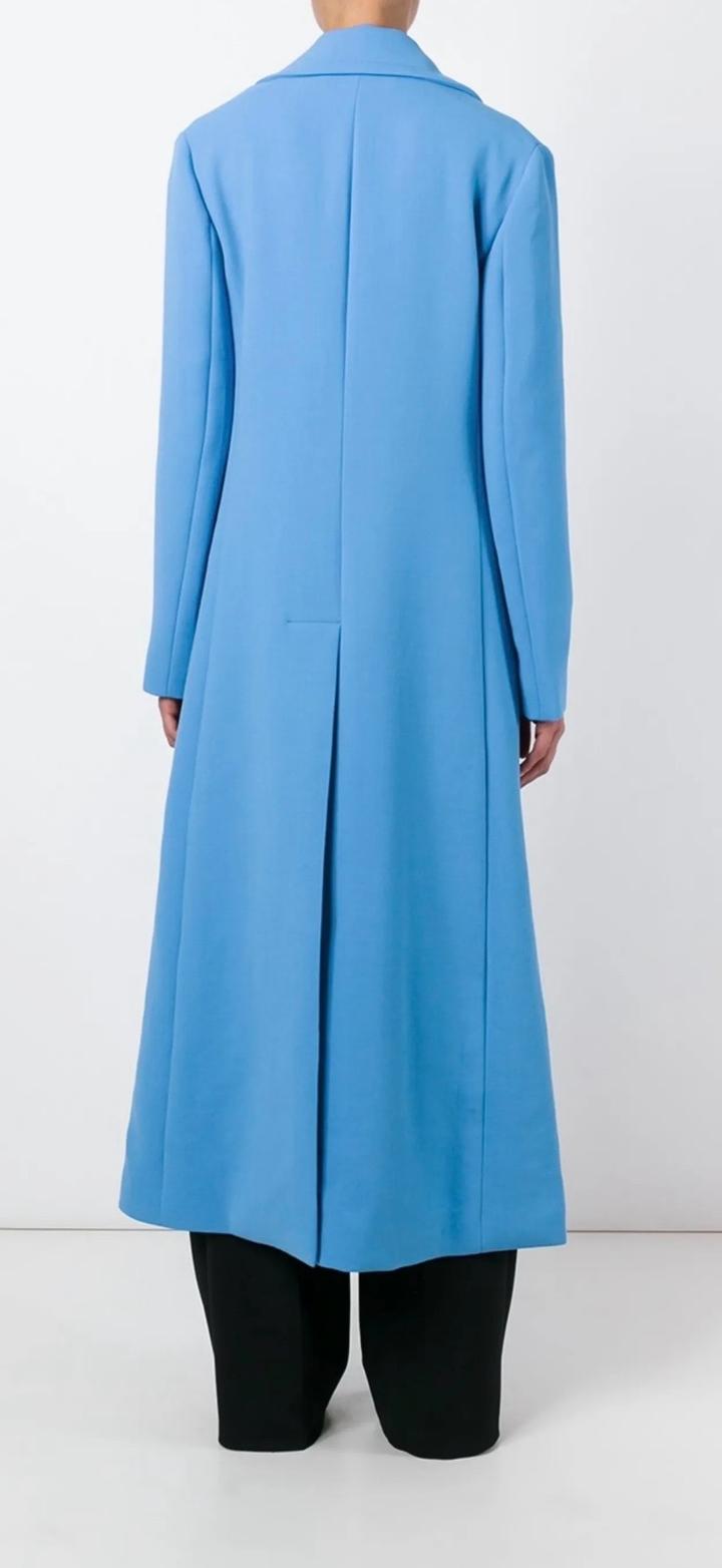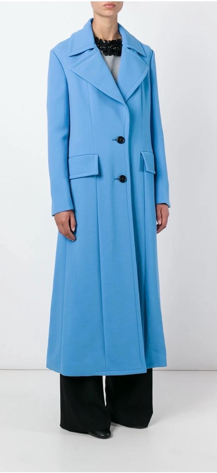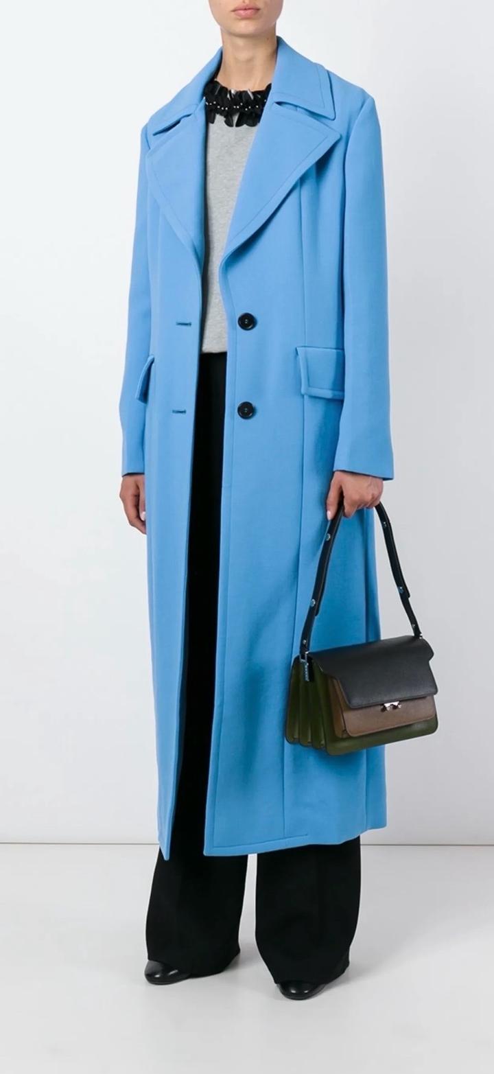 Голубое длинное однобортное пальто из натуральной шерсти от Marni. Зазубренные лацканы, застежка на пуговицах спереди, передние карманы с клапанами, длинные рукава, разрез на кайме сзади. Состав Шерсть, Вискоза, Хлопок Артикул: 465738