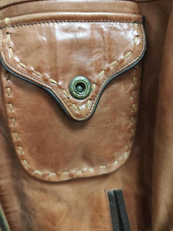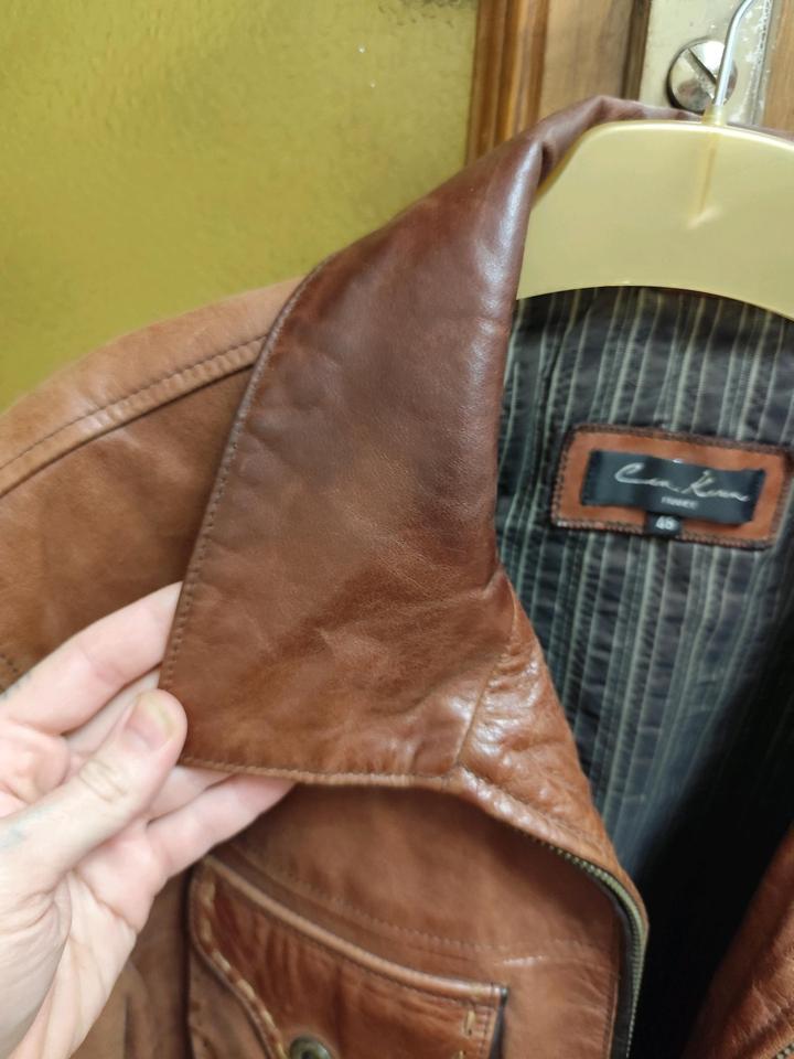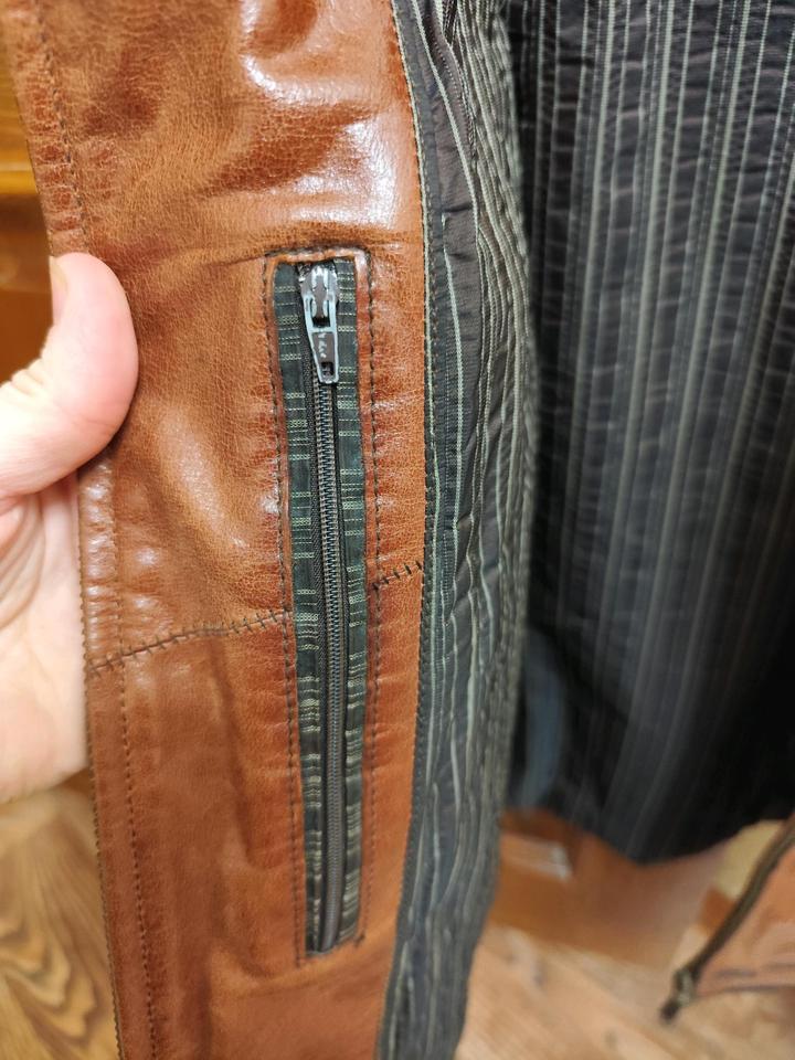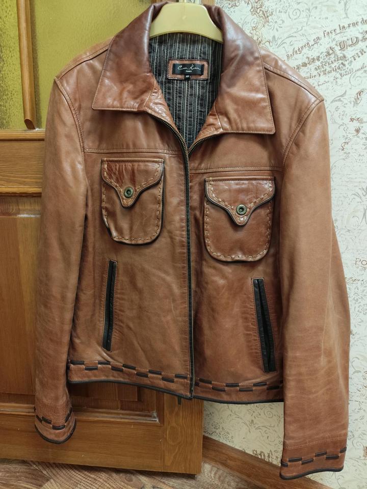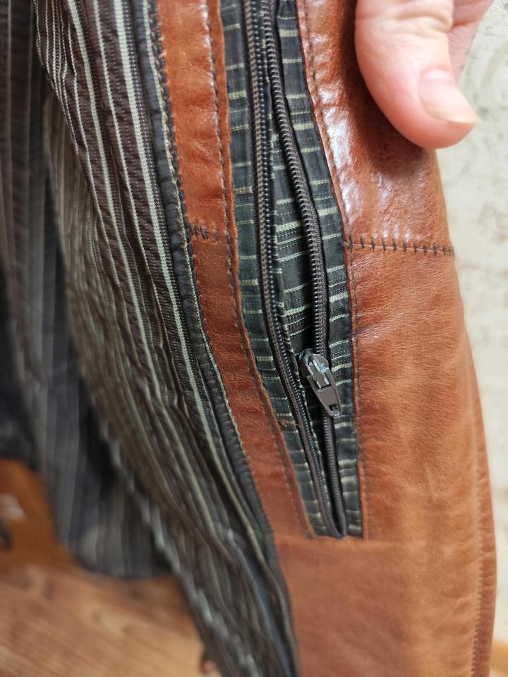 Верх: натуральная кожа (мягкая телячья кожа) подклад: полиэстер (полосатая подкладочная ткань) Сломан замочек на внутреннем левом кармане, с права рабочий. Естественная патина на воротнике. Хорошее состояние. Артикул: 467173