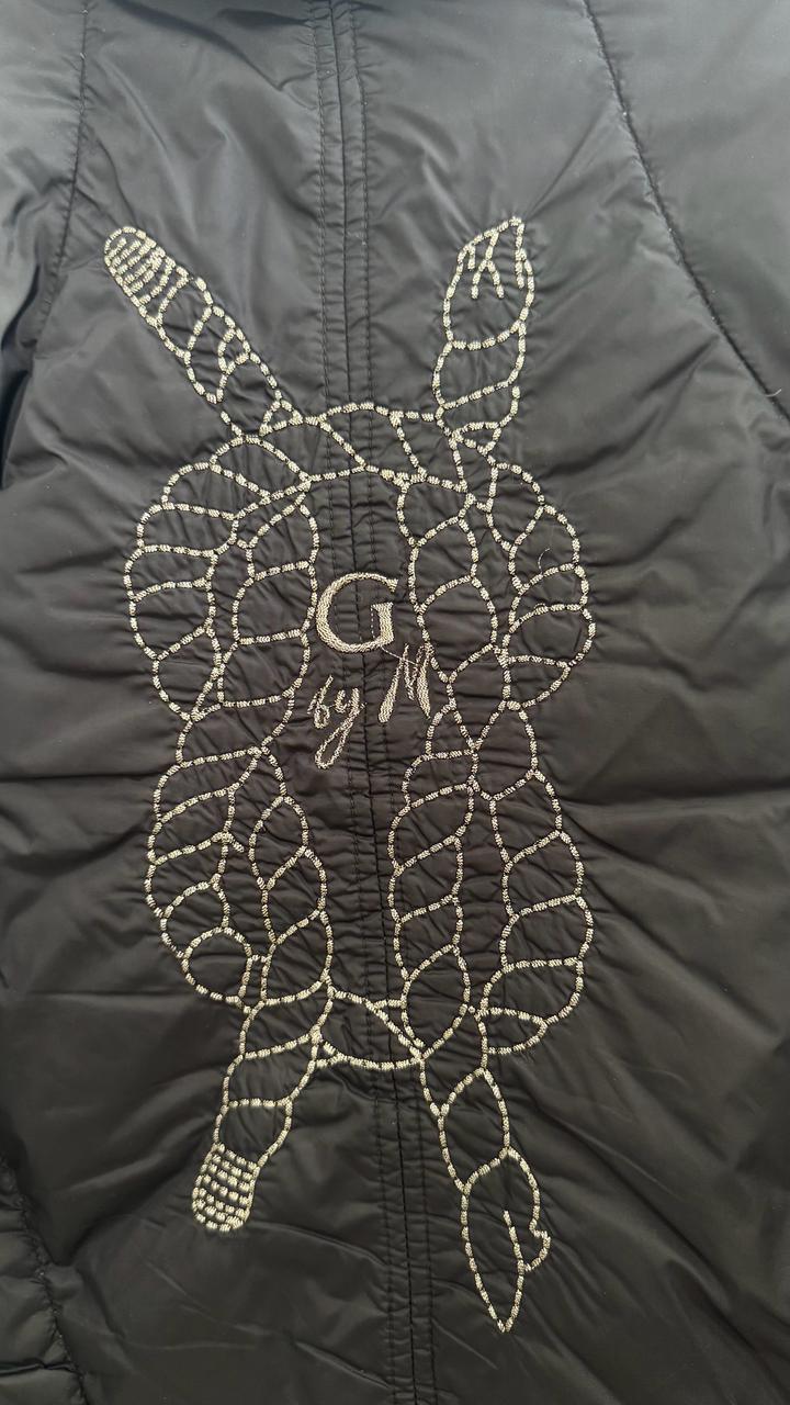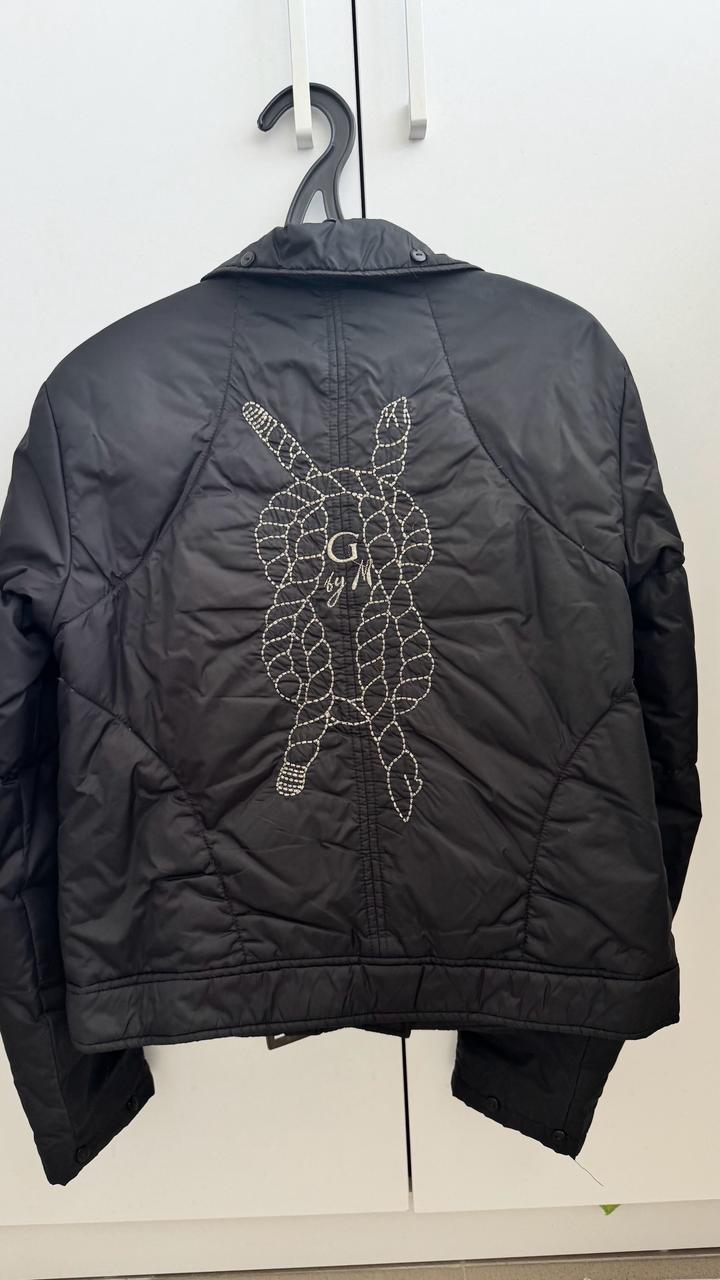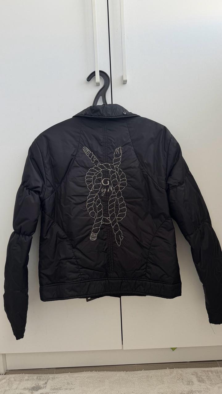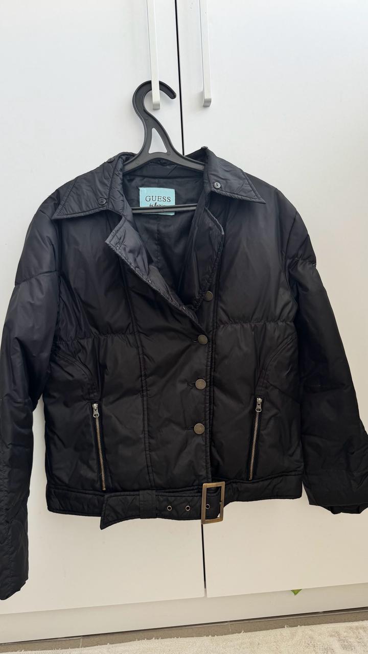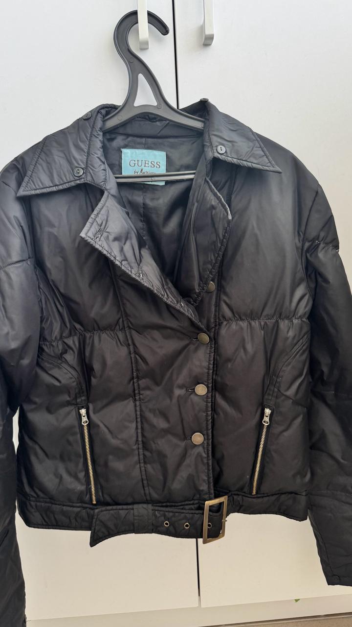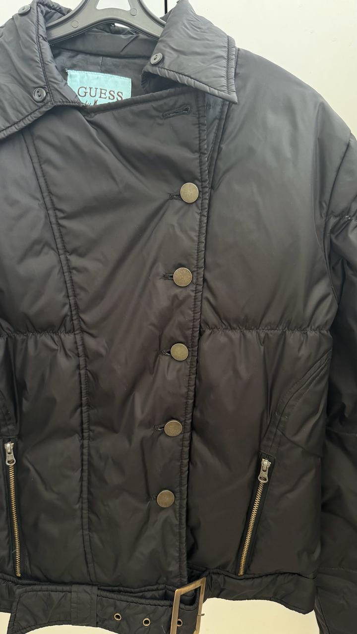 Черная ветровка на пуху,застегивается на пуговицы,снизу ремешок.На рукавах и воротнике мелкие пуговки.Очень красивая вещь. Единственное самой верхней пуговицы нет. Артикул: 467518