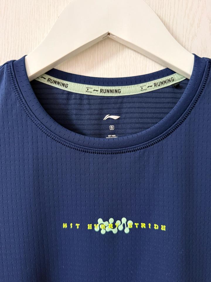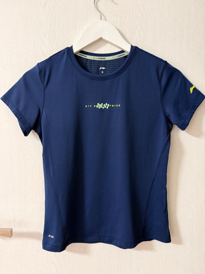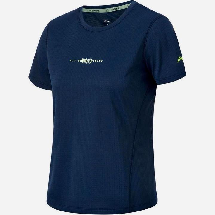 женская спортивная футболка бренда Li-Ning (модель ATSU190-6), выполненная в темно-синем цвете и предназначенная для бег. Артикул: 467532