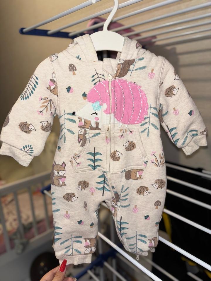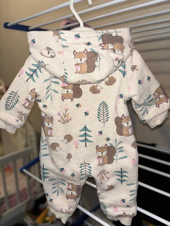 Теплый ромпер с капюшоном — размер 3-6 месяцев. Мягкий трикотаж с начесом, милый принт с белками и ежиком. Удобен как самостоятельная вещь или как поддева. Артикул: 468768
