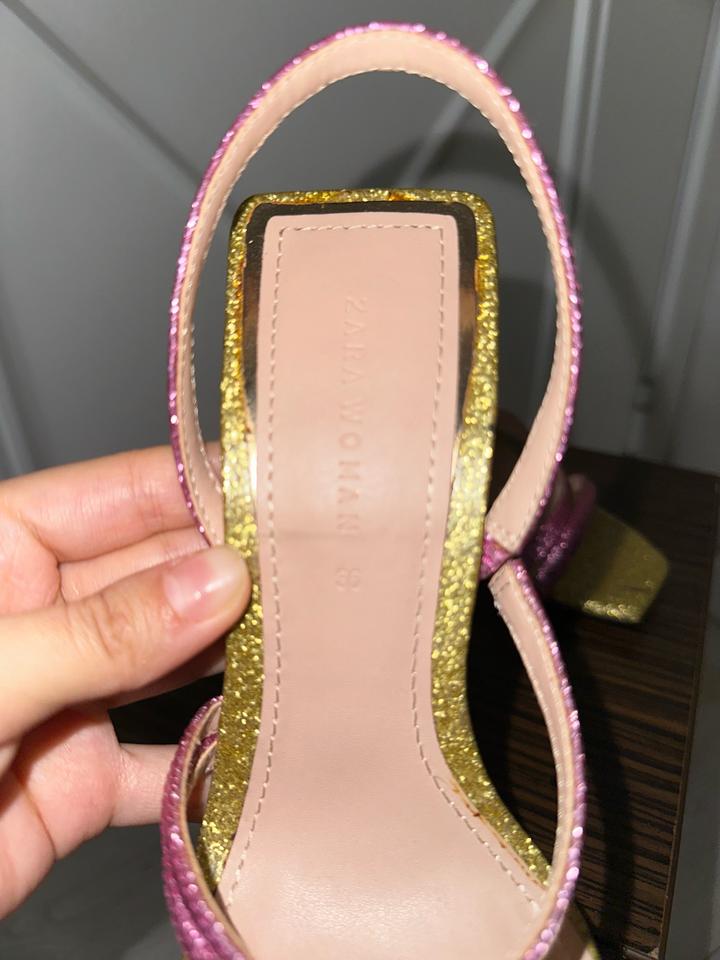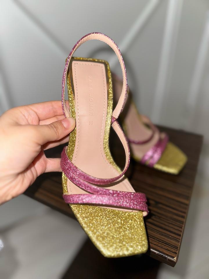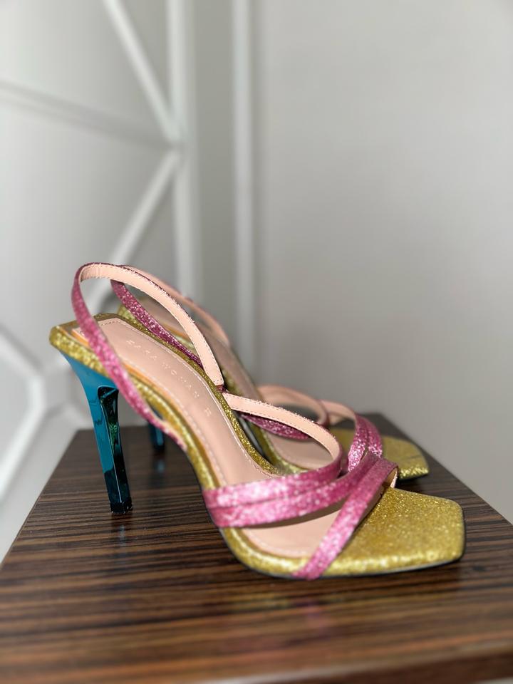 Продам эффектные босоножки от Zara Woman (артикул 1325/301). Модель выполнена в ярком праздничном стиле: тонкие перекрещивающиеся ремешки покрыты розовым и золотистым глиттером. Главная деталь — необычный каблук-«рюмочка» из прозрачного синего пластика с металлизированным блеском. Высота каблука: около 9,5 см. квадратный открытый мыс, удобная фиксация пятки, очень красиво переливаются при искусственном свете. Идеально подойдут для вечеринки, выпускного или летнего торжества. Носили один раз! Артикул: 468788