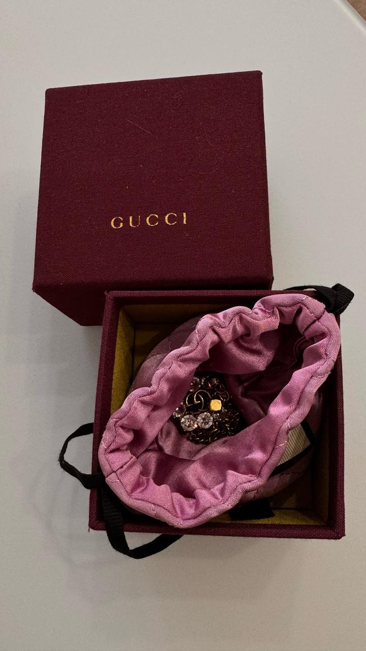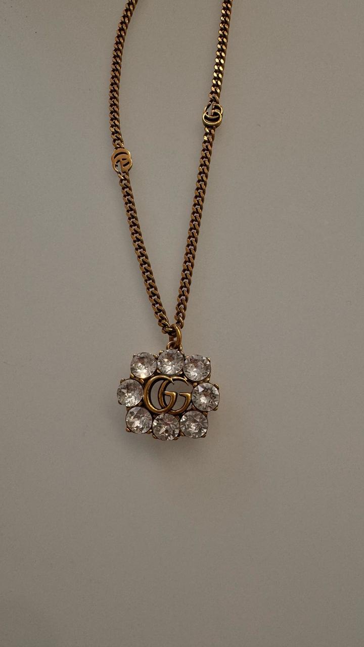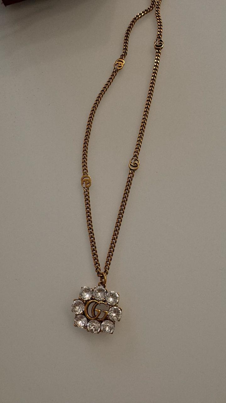 Золотистая цепочка (плетение похоже на панцирное), а внизу — подвеска с логотипом GG бренда Gucci, украшенная круглыми прозрачными камнями. Артикул: 469466