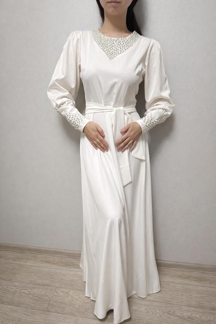 Длинное платье в классическом стиле с декоративной отделкой на вороте и манжетах. Есть пояс, красиво подчёркивает талию. Подходит для торжеств, никаха, мероприятий. Состояние хорошее. Артикул: 470308