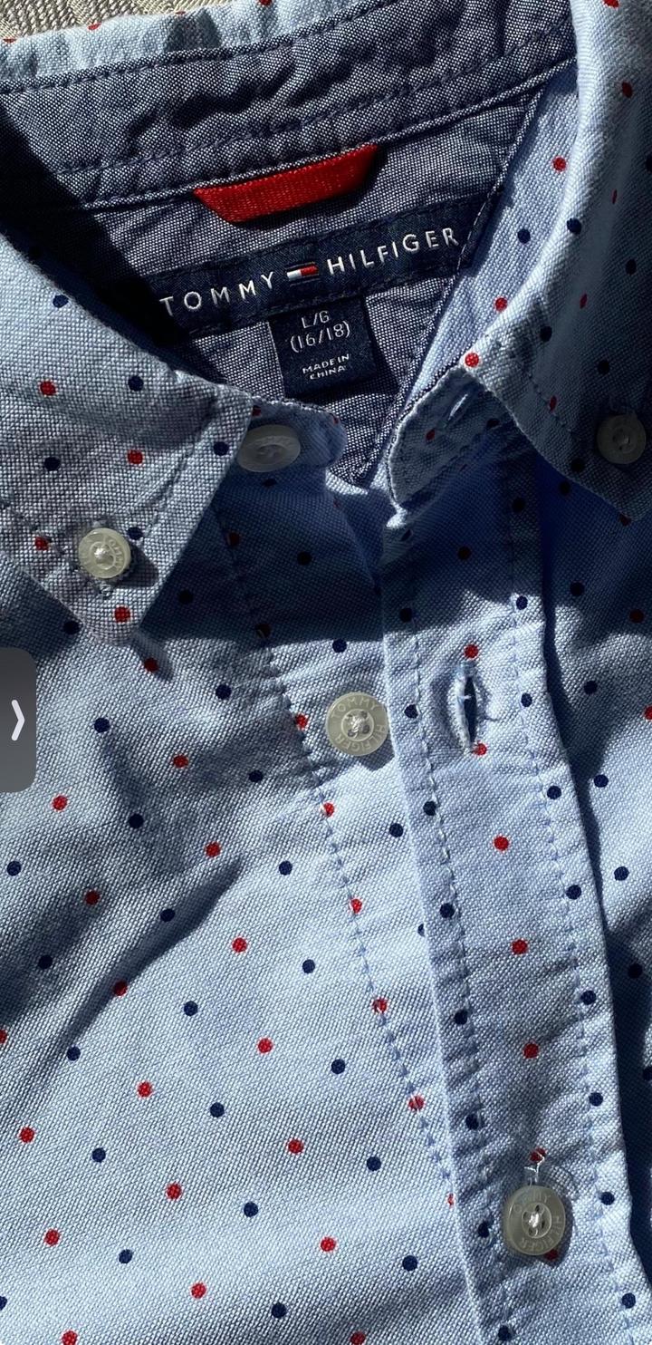 Рубашка Tommy Hilfiger на подростка, либо на невысокую миниатюрную девушку * Оригинал 100%, фирменные пуговицы, нашивка * Размер по ярлыку: L/G (16/18) * Цвет: голубой в горошек * 100 % хлопок * Состояние отличное, следов носки нет, дефекты, пятна, дырки отсутствуют * Сын надел только единожды, оказалась впритык, без запаса по росту * Приобреталась через байера за 40 $ * При необходимости могу сделать дополнительные фото и замеры Артикул: 470464