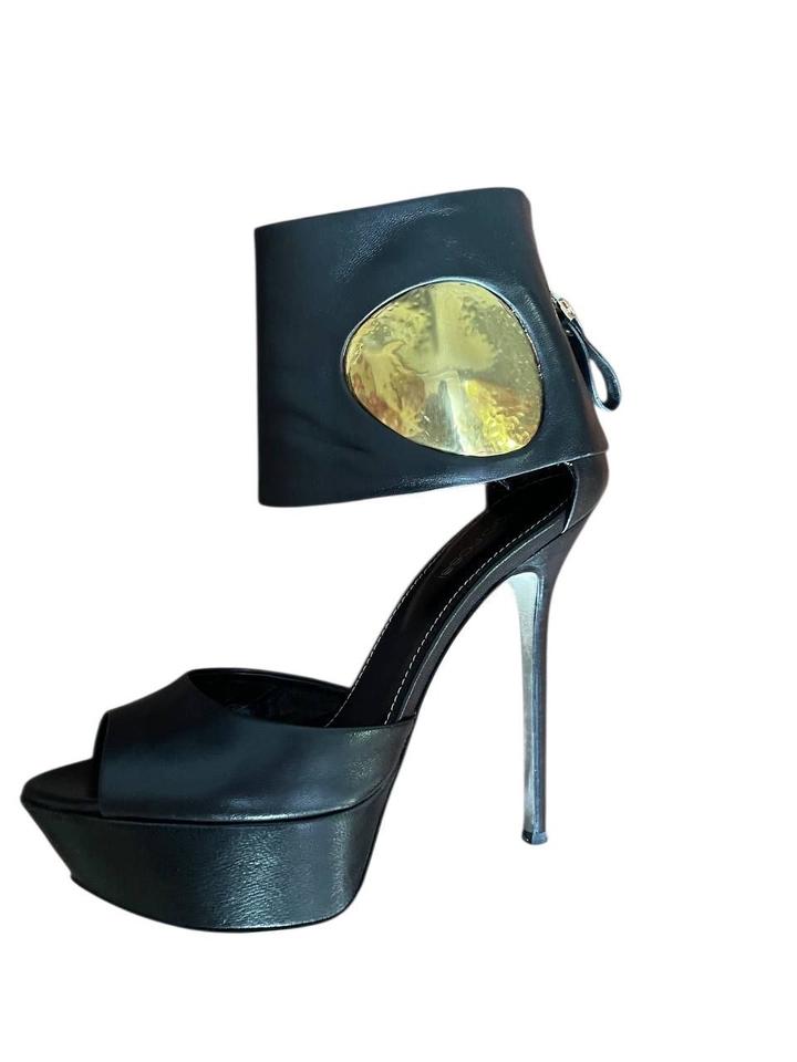 Черные босоножки из кожи с золотой деталью на каблуке 13 см. Артикул: 472958