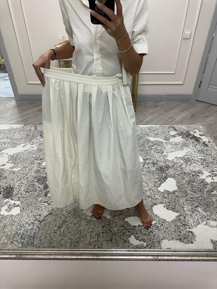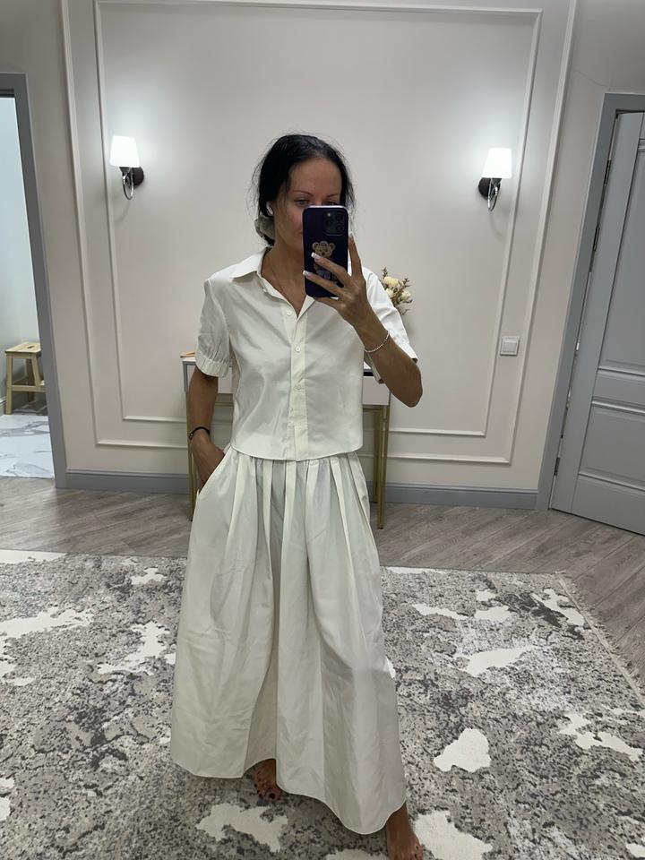 Костюм Zara. Укороченная рубашка размер по бирке М, юбка с карманами на резинке xs-s по бирке, но по ощущениям растянется до хl. Ткань похожа на плащевку, не маркая, не пропускает воду, если попадете под дождь. Очень красиво смотрится и с туфлями и кедами, комфортная длина макси. Состояние очень хорошее. 1 выход. Артикул: 473323