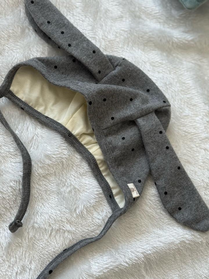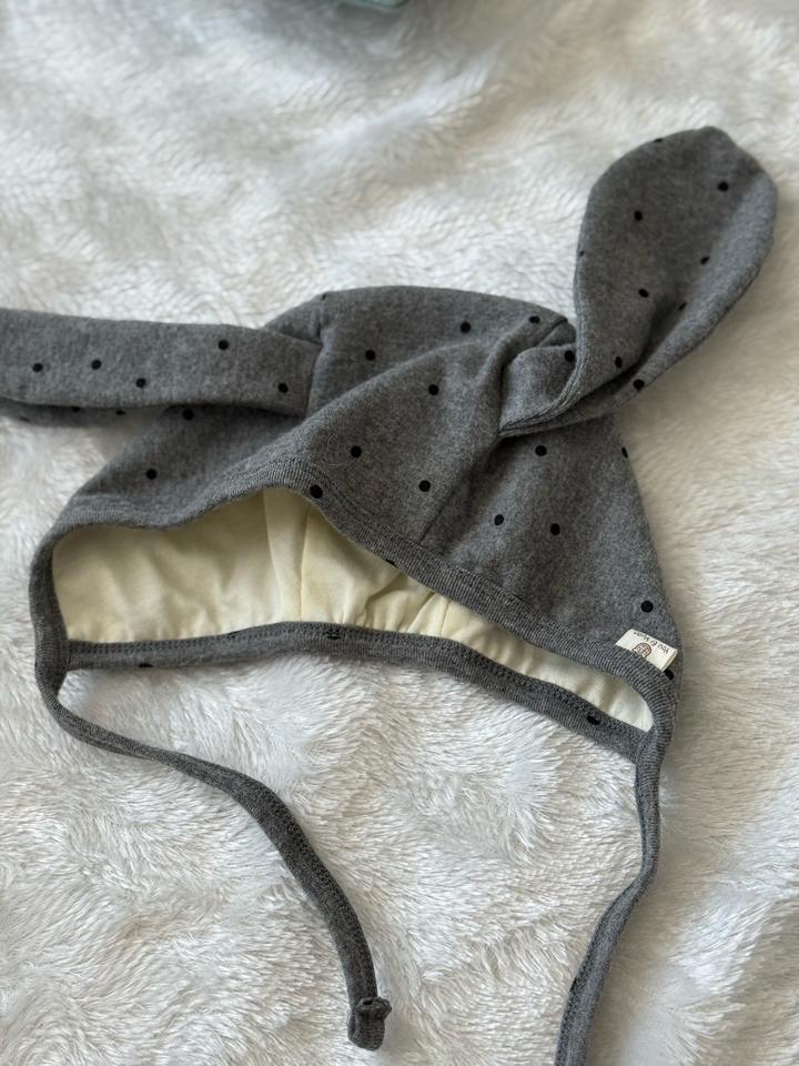 Классная шапка на теплую весну, купили, но подарили другую, размер до года, закрывает сзади и уши все прекрасно, на мягких завязках, хлопок, ушки мило висят Артикул: 473613
