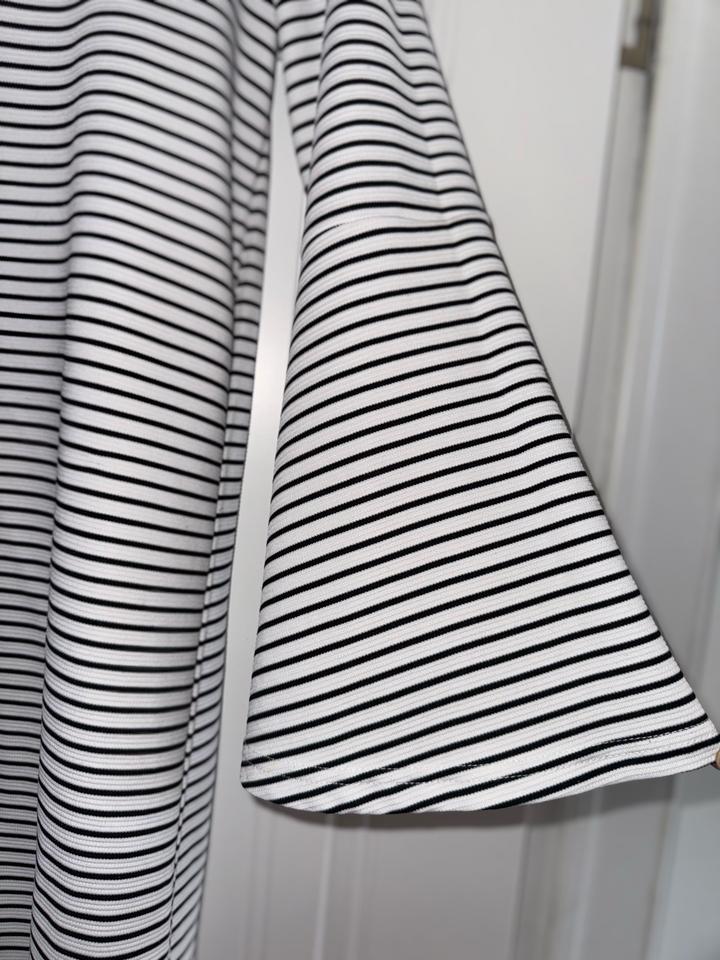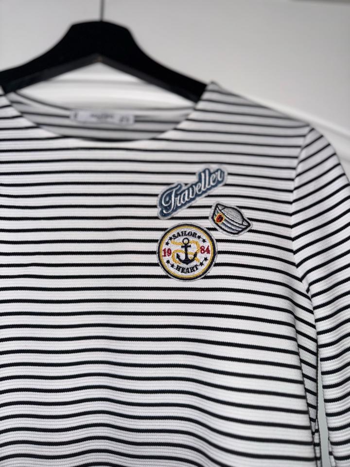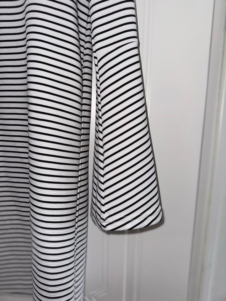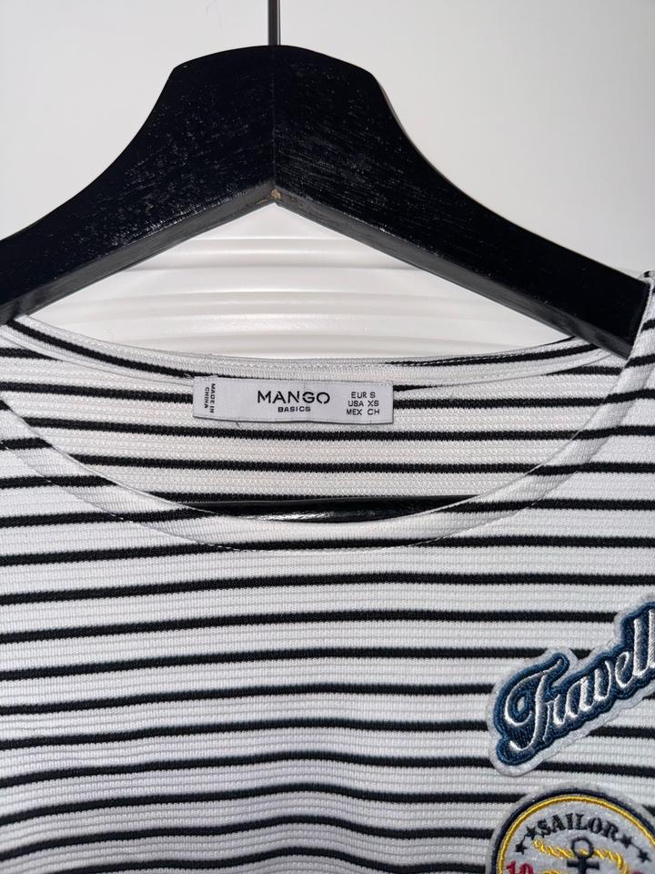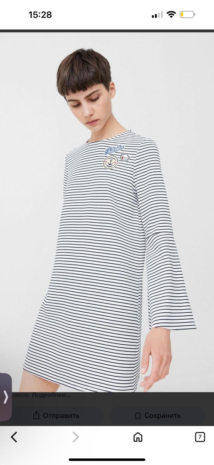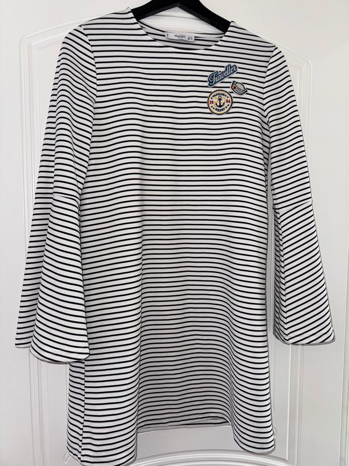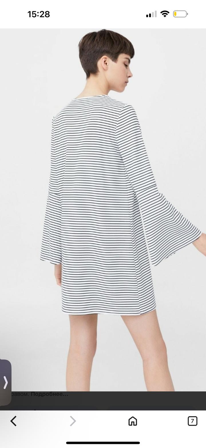 платье Mango в черно-белую полоску с длинными рукавами-клеш и вышитыми нашивками в морском стиле Размер С Торг Артикул: 473657