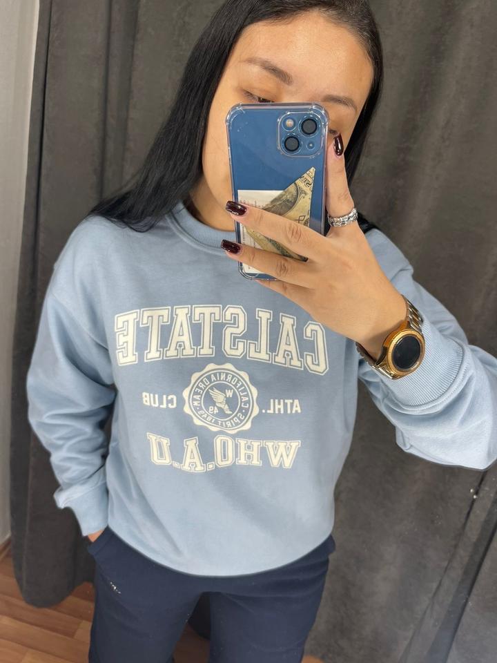 Голубой свитшот от Корейского бренда WHO A U двухнитка размер S большемерит подходит и на М Артикул: 473680