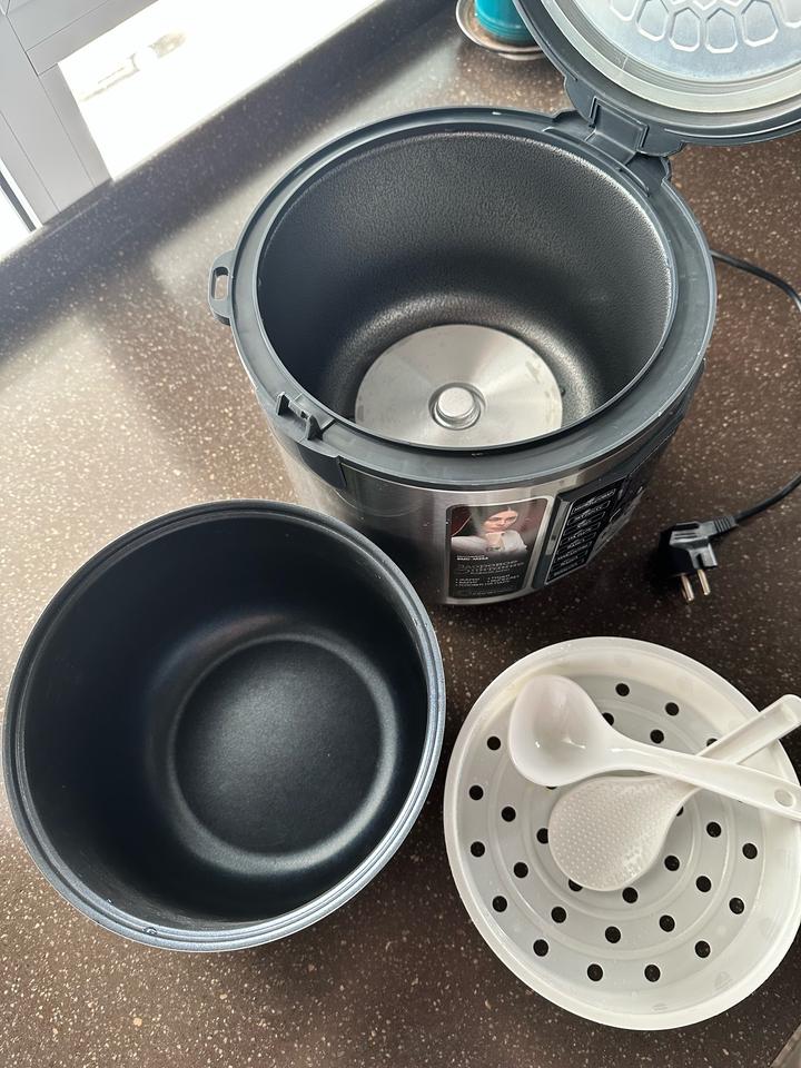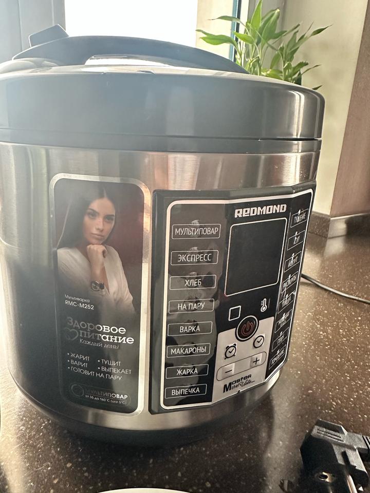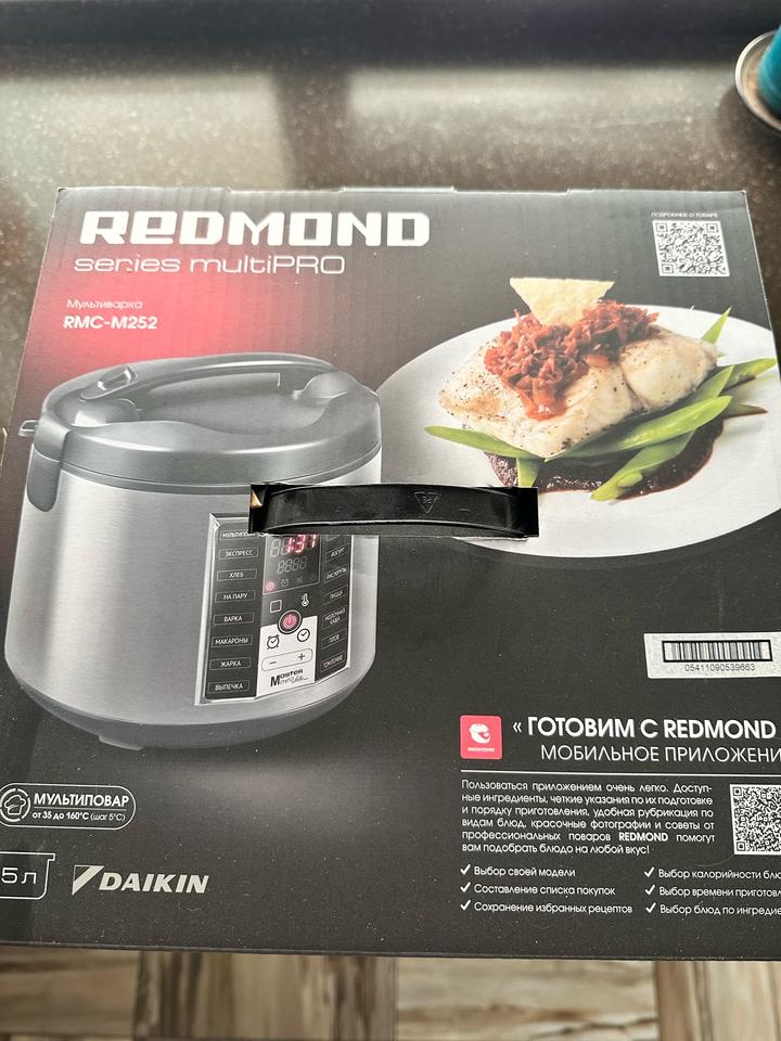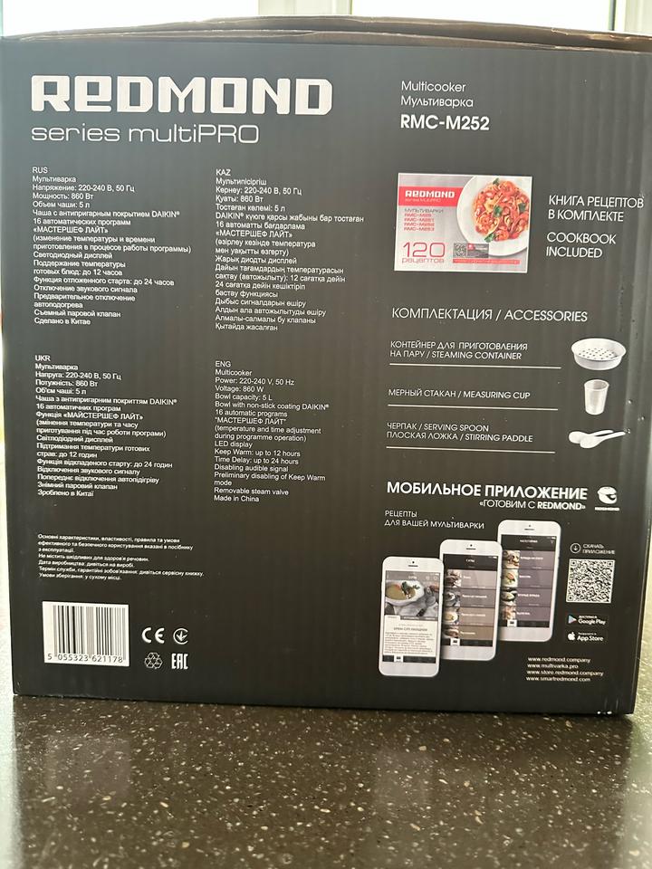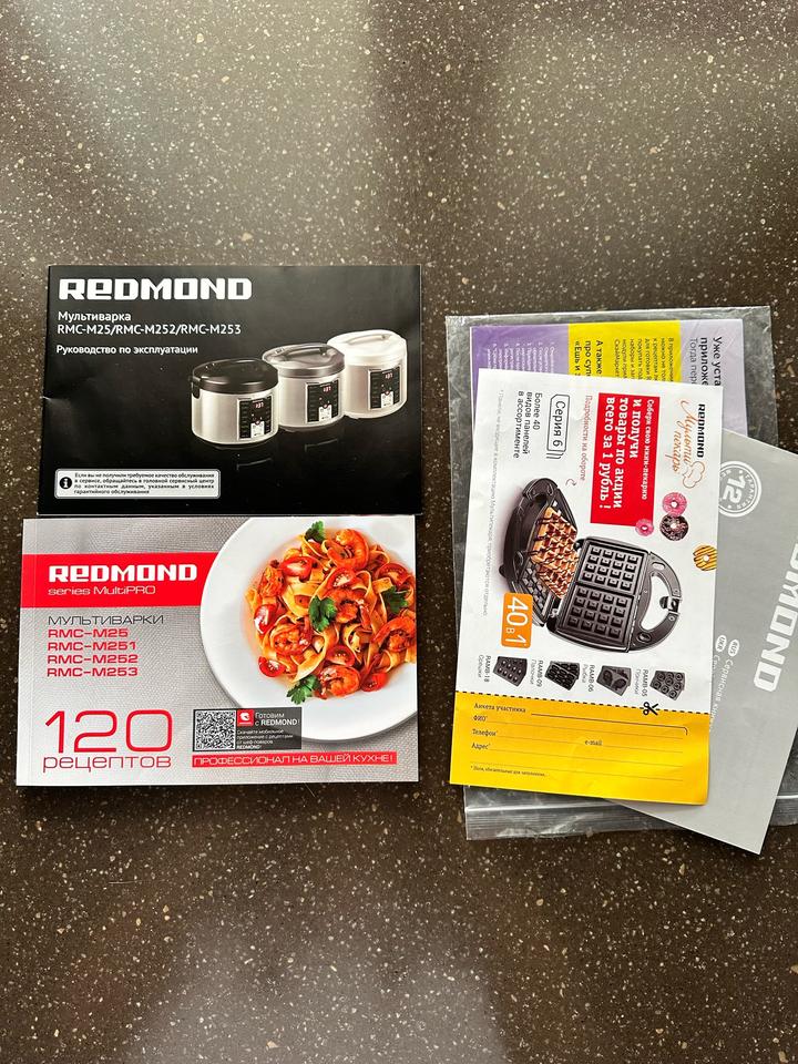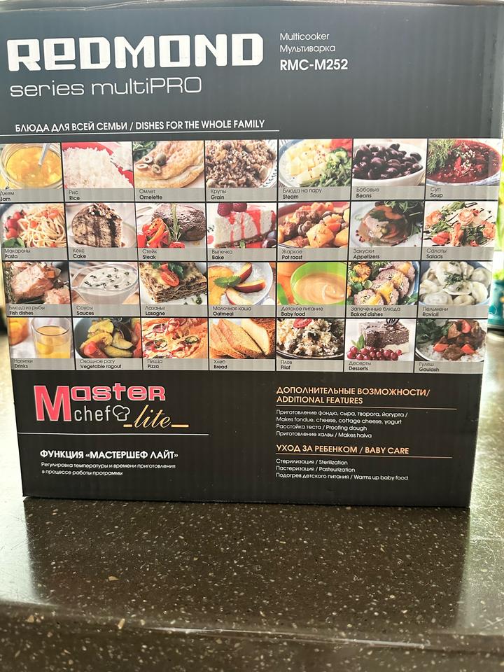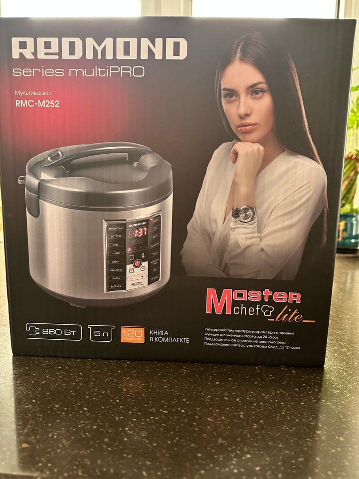 Мультиварка redmond series multipro 120 рецептов, пользовались пару раз. Мерный стакан утерян. В комплекте коробка, книга рецептов , контейнер для приготовления на пару слегка деформирован, черпак, плоская ложка. Б/у Артикул: 475454
