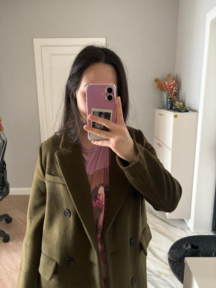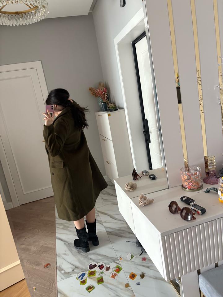 Пальто насыщенного темно-оливкового цвета. Прямой крой. Есть карманы. Все прошито аккуратно, сидит на теле очень комфортно. Подойдет на S-M. Но пальто в целом прямое, не оверсайз, поэтому если по фигуре, то снизу объемный свитер может, допустим, не влезть. Если на XS-S, может и с кофтой теплой снизу можно носить. У меня размер М, рост 168. В составе 80% натуральной шерсти, 20% полиэстер. Ткань теплая, но из-за шерсти немного колючая, если на голую кожу. Писали, что не пропускает ветер. Подклад⛔️ Артикул: 475501