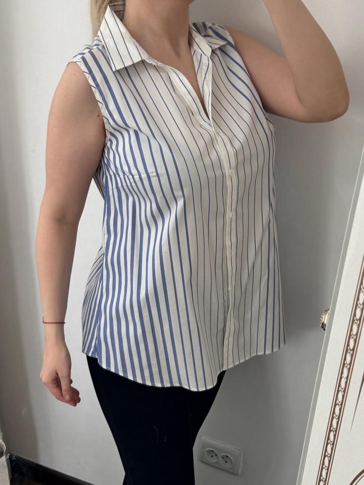 • Дизайн: Стильная белая рубашка в вертикальную синюю полоску. Свободный крой, без рукавов — идеальный вариант для многослойных летних образов или под жакет. • Размер: S-M. • Цена: 5600 тг. Артикул: 475604