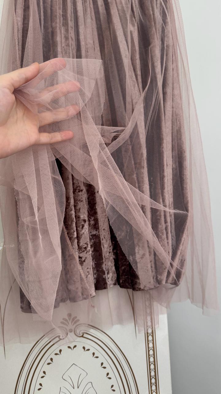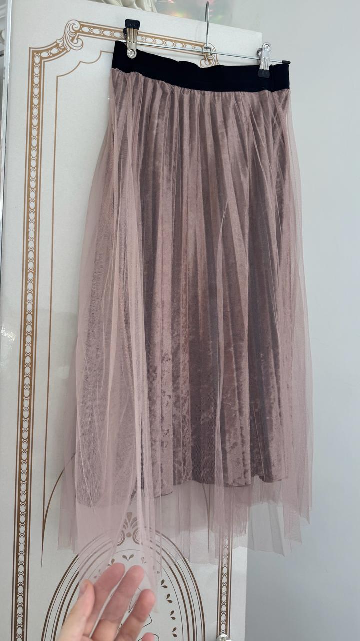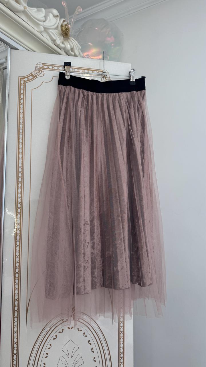 • Необычная двухслойная модель. Нижний слой — мягкий переливающийся бархат (велюр) цвета пыльной розы, верхний слой — легкий воздушный фатин в тон. • Посадка: На талии удобная широкая эластичная резинка черного цвета, которая хорошо тянется и подчеркивает силуэт. • Состояние: Отличное. Артикул: 475877