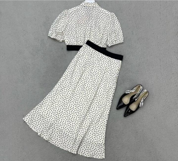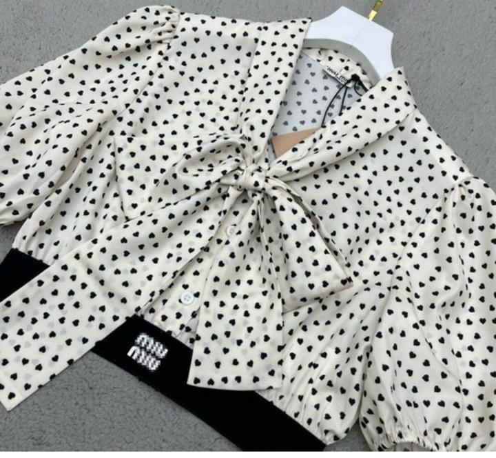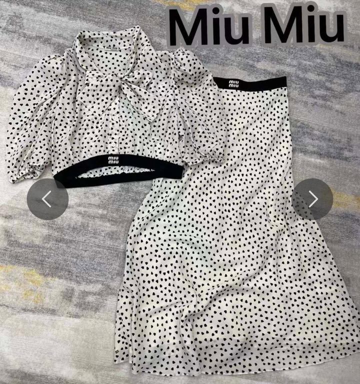 женский костюм-двойка, представленный на изображении, состоит из укороченного топа с пышными рукавами и длинной юбки, выполненных из легкой ткани в мелкий горошек ( сердечки). На поясе изделий виден брендинг Miu Miu. Артикул: 476746