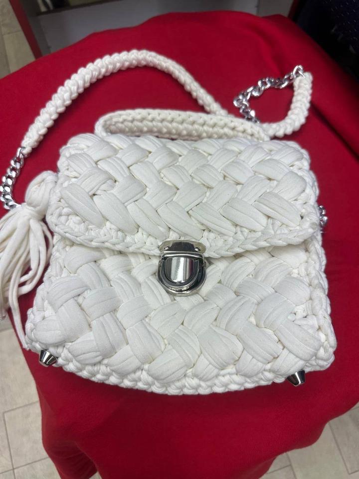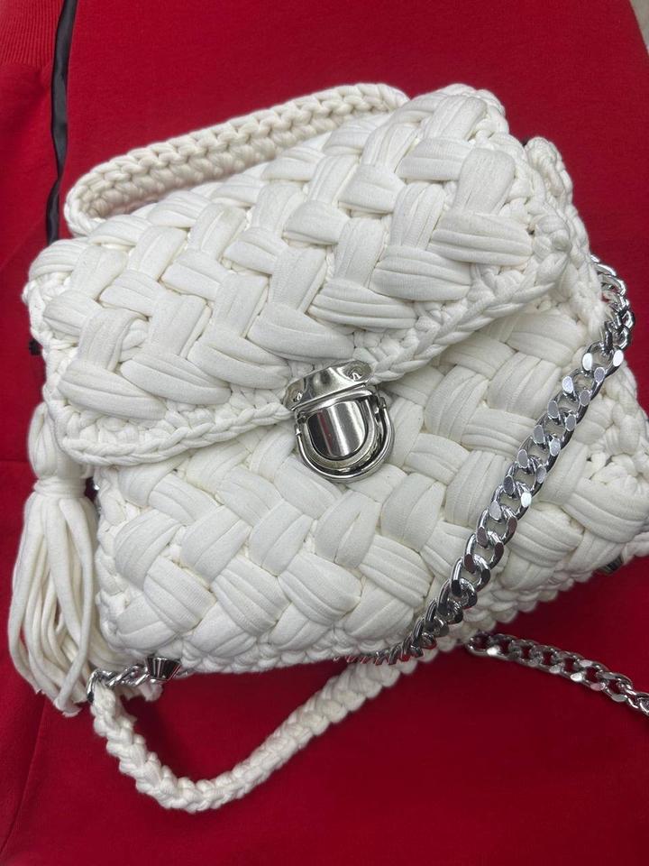 Сумка белая вязанная, новая, ткань качественная. Внутри красивый подклад, один отсек. Длинный ремешок, можно снять. Единственный минус, нужно будет слегка почистить, запылилось немного по краям. Из за этого цену снижу, а так эта ручная работа. Артикул: 477308